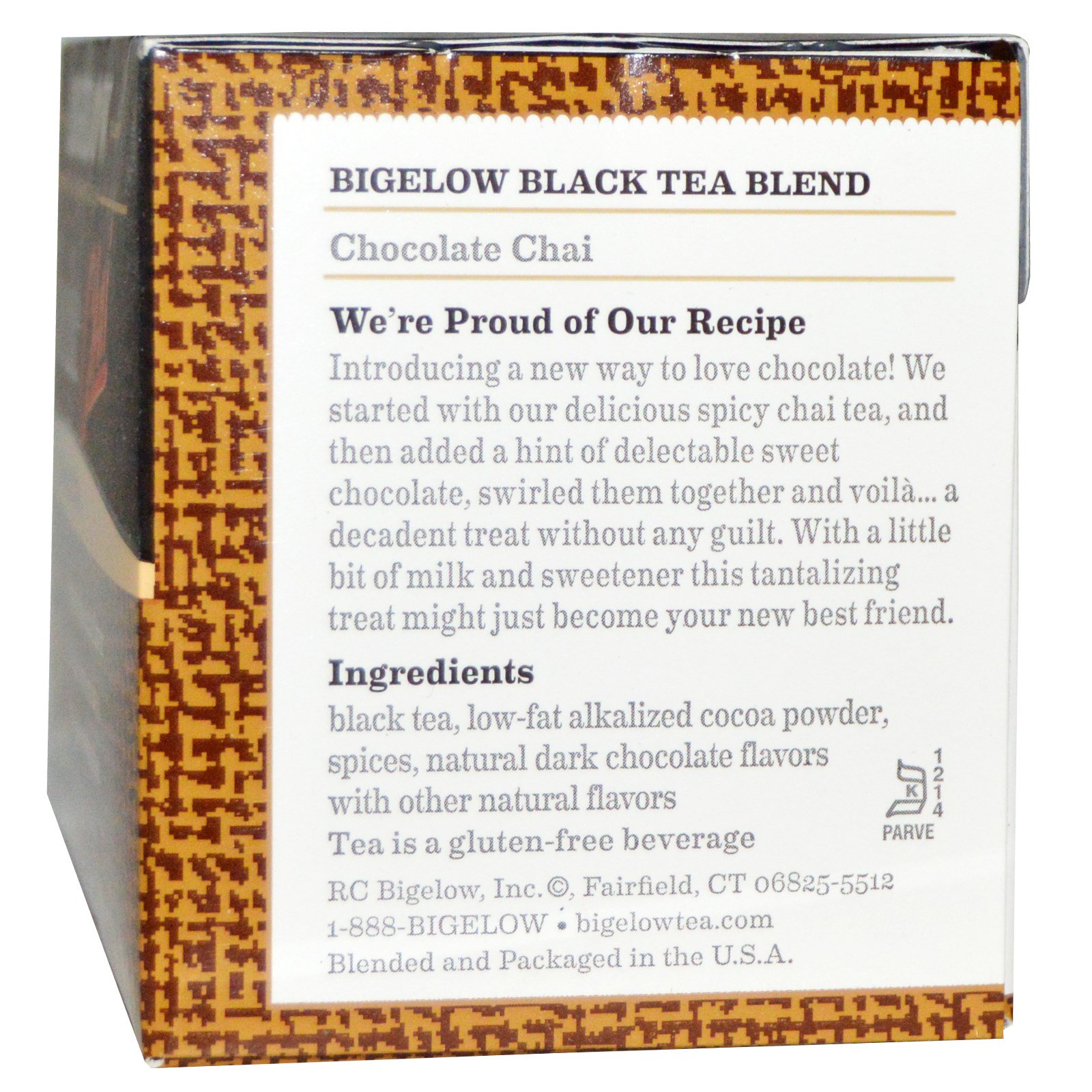 Chá preto, pó de cacau alcalino de baixo teor de gordura, especiarias, sabores de chocolate escuro natural com outros sabores naturais