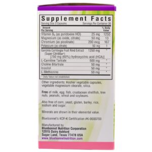 As Cápsulas Vegetais Skinny Garcinia de Bluebonnet são formulados especialmente com o extrato patenteado da fruta Garcinia cambogia, do sul da Ásia, conhecido como Super CitriMax, que é padronizado para 60% (750 mg) de ácido hidroxicítrico (HCA). Esta fórmula de combinação também contém L-carnitina, cromo, colina, inositol, vitamina B6, metionina e eletrólitos importantes. Quando combinado com dieta e exercícios adequados, esta fórmula não estimulante livre de cafeína pode ajudar no controle de um peso saudável: