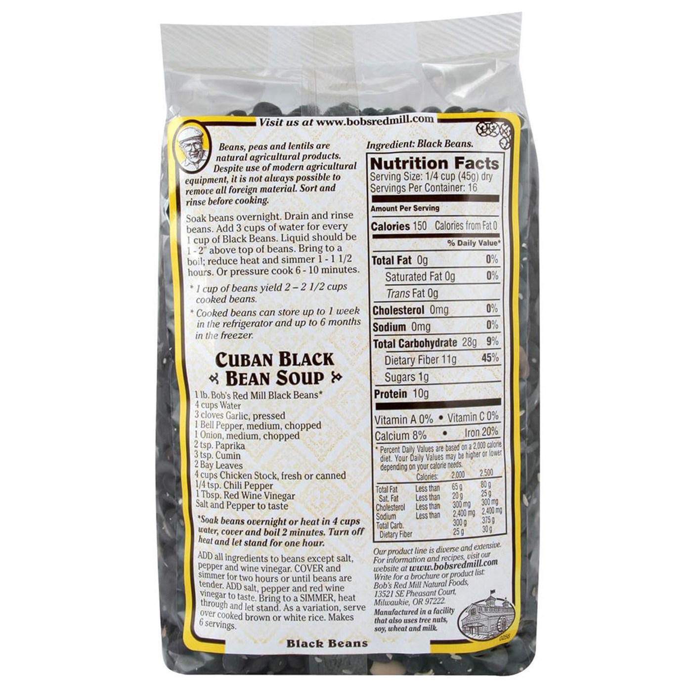 Recomendações de uso: Soak beans overnight. Drain and rinse beans. Add 3 cups of water for every 1 cup of black beans. Liquid should be 1 to 2 inches above top of beans. Bring to a boil, reduce heat and simmer for 60 to 90 minutes. Or pressure cook six to 10 minutes. One cup of beans yield two to 2 1/2 cups cooked beans.
