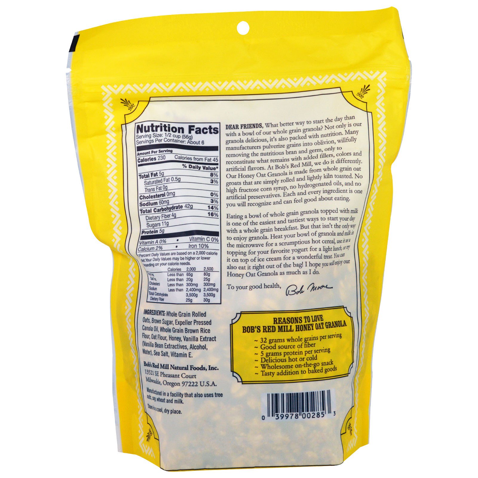 Caros Amigos, existe jeito melhor de começar o dia do que com uma bela tigela de nossa granola integral? Nossa granola não é apenas deliciosa, mas é também repleta de nutrição. Muitos fabricantes destróem os grãos a ponto de fazê-los perder tudo o que têm, removendo seus nutrientes, o farelo e o gérmen. Depois reconstituem tudo isso com corantes e outros aditivos artificiais. No Bob’s Red Mill fazemos diferente. Nossa Granola Clássica é feita de grumos de aveia integrais que são fervidos e levemente torrados. Sem xarope de milho, sem óleos hidrogenados, e sem conservantes artificiais. Cada um dos ingredientes você poderá reconhecer e sentir-se bem ao comer.