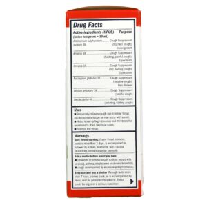 Advertências: A persistent cough may be a sign of a serious condition. If cough persists for more than 1 week, tends to recur, or is accompanied by fever, rash, or persistent headache, consult a doctor. Do not take this product for persistent or chronic cough such as occurs with asthma, or if cough is accompanied by excessive phlegm unless directed by a doctor. Keep out of the reach of children.