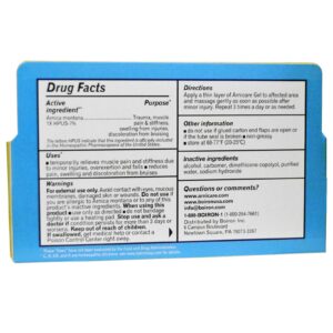 Somente para uso externo. Evite contato com os olhos, membranas mucosas, pele lesionada ou ferimentos. Não use se tiver alergia à arnica ou a qualquer um dos ingredientes inativos deste produto. Ao usar este produto. Use apenas conforme recomendado. Não use curativos apertados ou compressa quente. Suspenda o uso e consulte um médico se a condição persistir por mais de 3 dias ou piorar. Mantenha fora do alcance de crianças. Se engolido, procure assistência médica ou um centro toxicológico imediatamente.