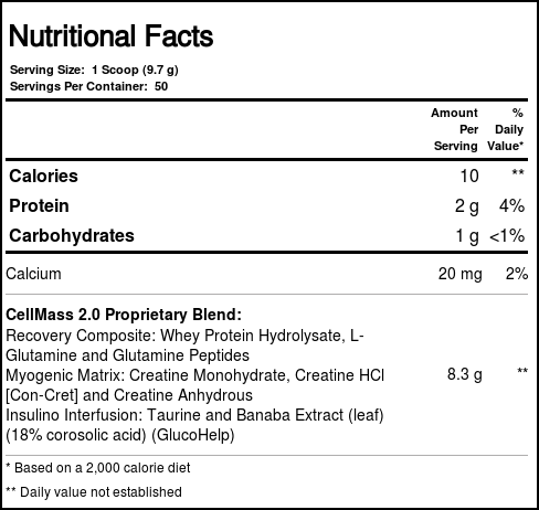 Recomendações de uso: Como Suplemento Alimentar, mix 1 scoop with 4-6 oz of cold water ou any beverage of your choice twice a day. Cellmass 2.0 ingredients when used as directed, at maximum dosage, over time, combined with a healthy diet and regular exercise are designed to suppout recovery, endurance, perfoumance, muscle and strength.