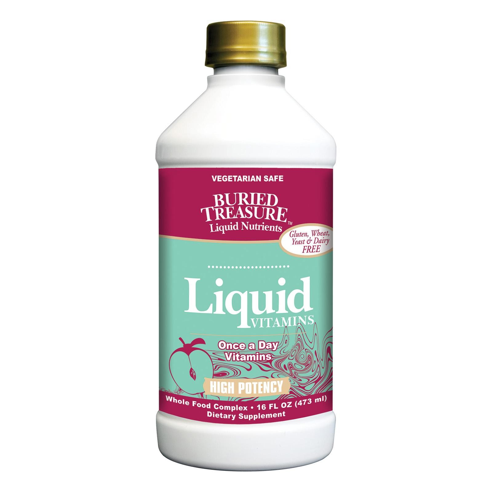 Buried Treasure Liquid Vitamins Description: High Potency A Daily Source of High Potency Vitamins Blended with Apple and Raspberry Juice. Vegetarian Safe Whole Food Complex High Potency Liquid Vitamins provides your body a complete spectrum of vital nutrients – FAST! They are easier to absorb and work faster than any tablet, capsule or gelcap avaliable.They are blended with apple, raspberry, pear, and cherry juices to provide a great tasting product without any added sugars or sweeteners. Free Of Yeast, gluten, dairy and wheat. Disclaimer These statements have not been evaluated by the FDA. These products are not intended to diagnose, treat, cure, or prevent any disease.