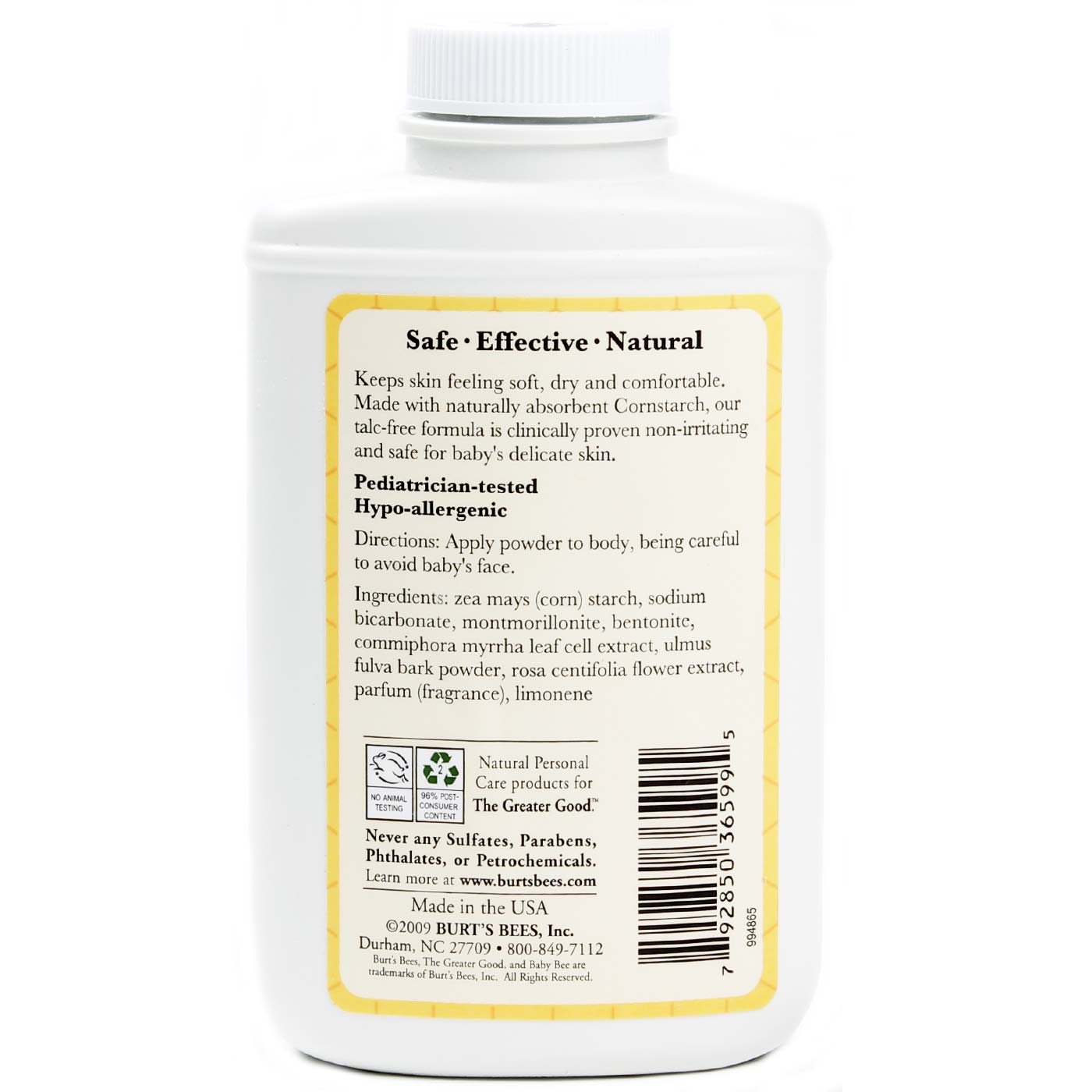 Notas: Talc free. 99.6% natural. Hypoallergenic. Non-irritating.