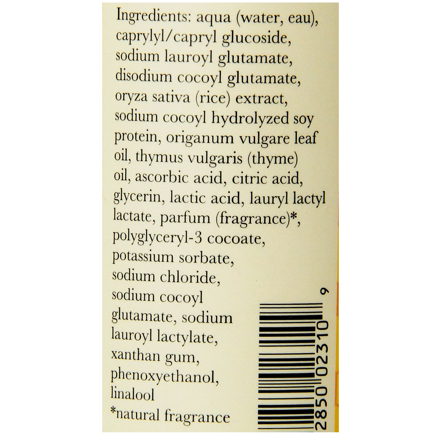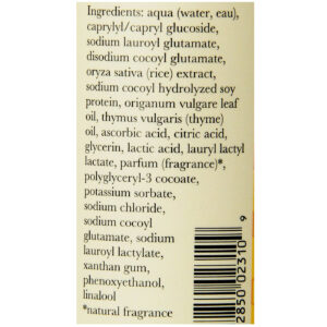 Ingredients: Aqua (water, eau), decyl glucoside, coco-betaine, lauryl glucoside, sucrose laurate, glycerin, parfum (fragrance), betaine, sodium cocoyl hydrolyzed soy protein, coco-glucoside, glyceryl oleate, sodium chloridexanthan gum, glucose, citric acid, glucose oxidase, lactoperoxidase, limonene.