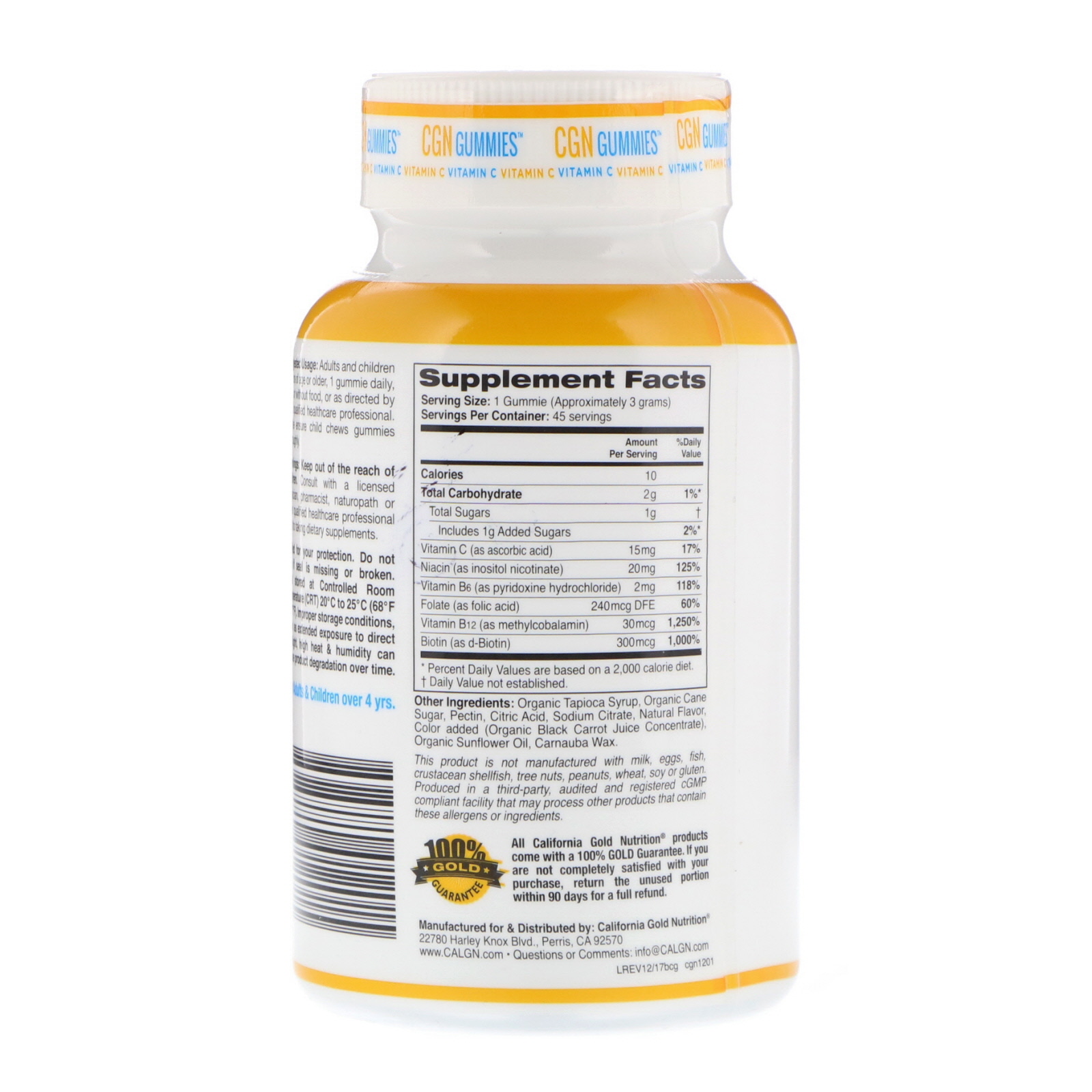 California Gold Nutrition® Gomas do Complexo B são fabricadas nos EUA e satisfazem ou excedem todas as especificações qualitativas e quantitativas de Controle de Qualidade.
