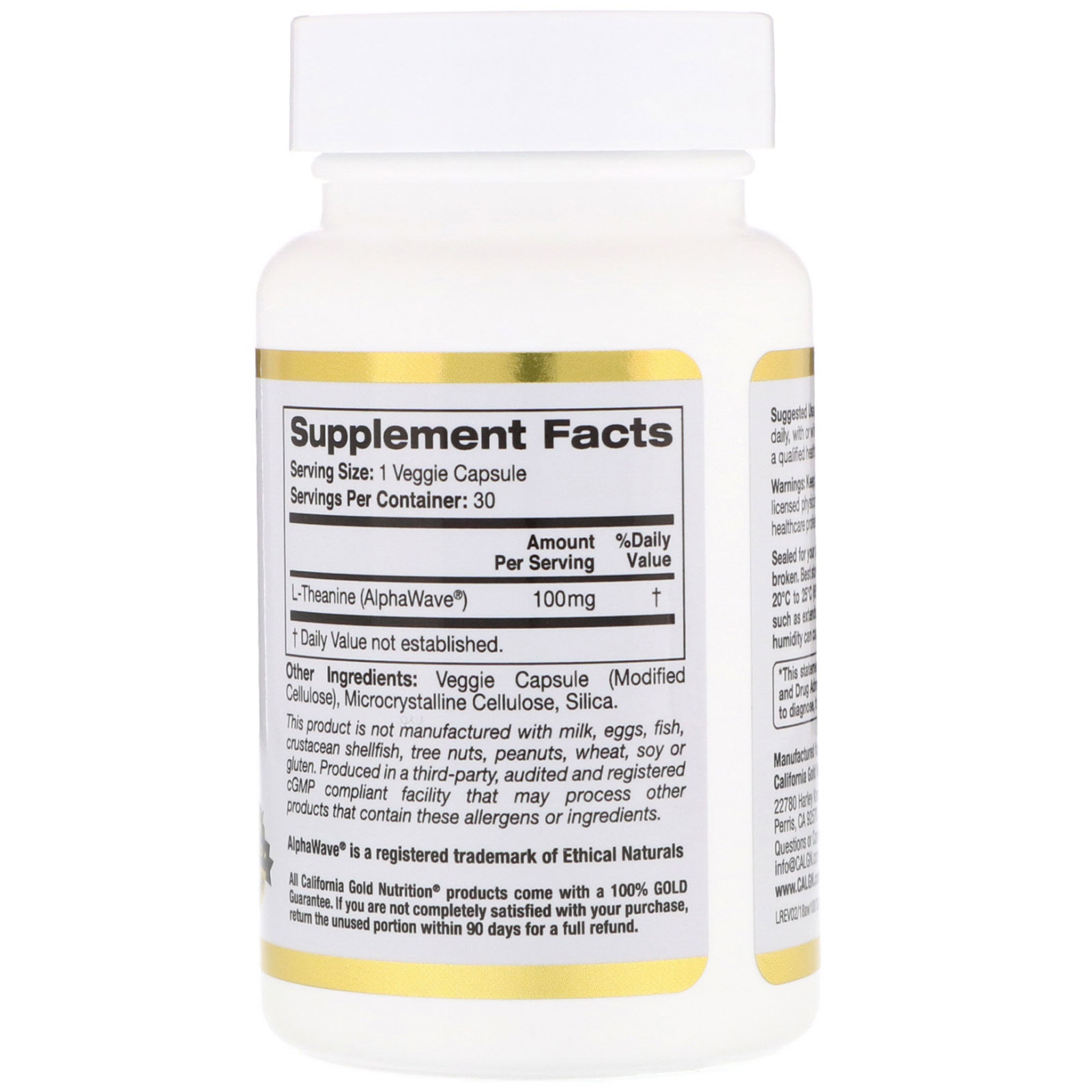 California Gold Nutrition® L-Teanina contém AlphaWave®, uma forma patenteada de L-Teanina altamente purificada padronizada para 98% L-Teanina. É fabricada nos EUA e atende ou excede todas as especificações qualitativas e quantitativas de Controle de Qualidade.
