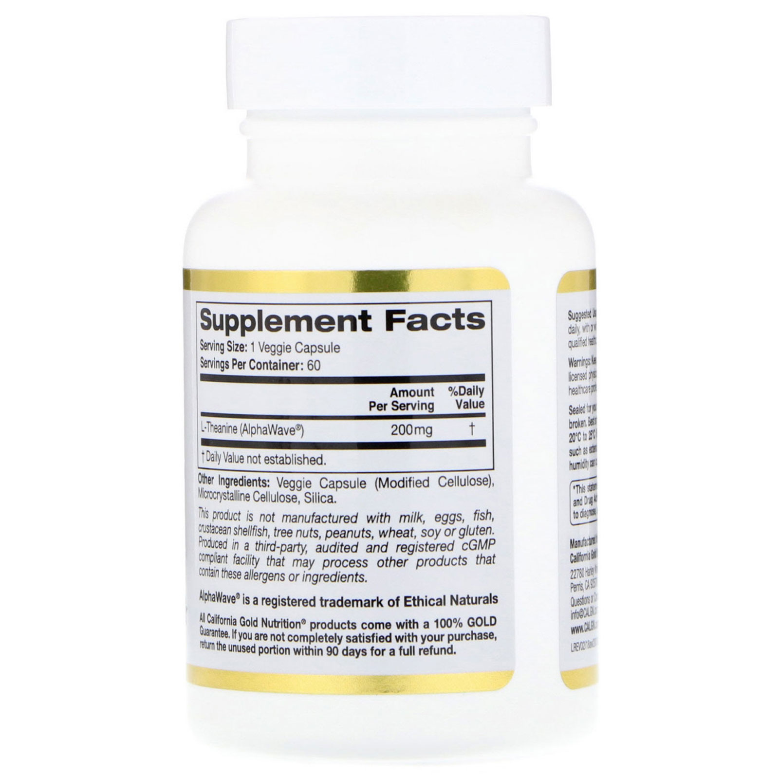 California Gold Nutrition® L-Theanine, features AlphaWave® a patented form of highly purified L-Theanine standardized to 98% L-Theanine. It is manufactured in the USA and meets or exceeds all qualitative and quantitative Quality Control specifications.