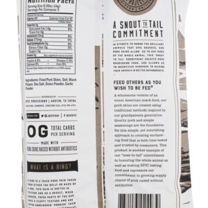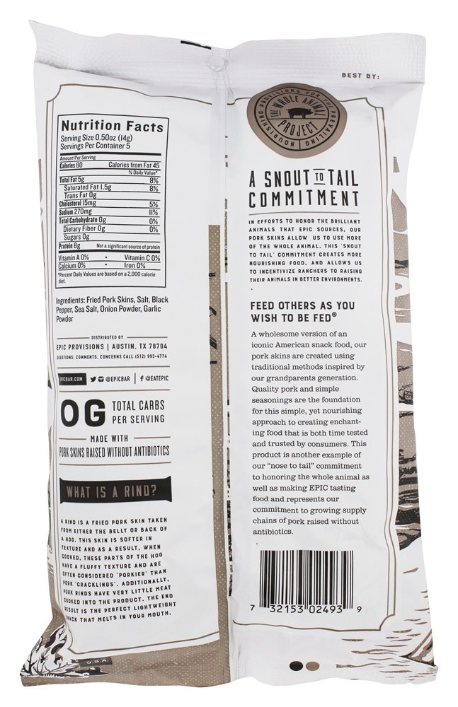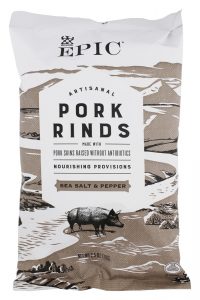 Marisco e carne de porco artesanal Épico Sal marinho e pimenta é uma versão saudável de um lanche americano icônico, peles de carne de porco do EPIC são criadas usando métodos tradicionais inspirados pela geração de seus avós. Uma mistura de carne de porco orgânica, não transgênica, pastada e livre de antibióticos combinada com temperos simples é a base para essa abordagem simples, porém nutritiva, de criar alimentos encantadores que são testados e confiados pelo consumidor.
