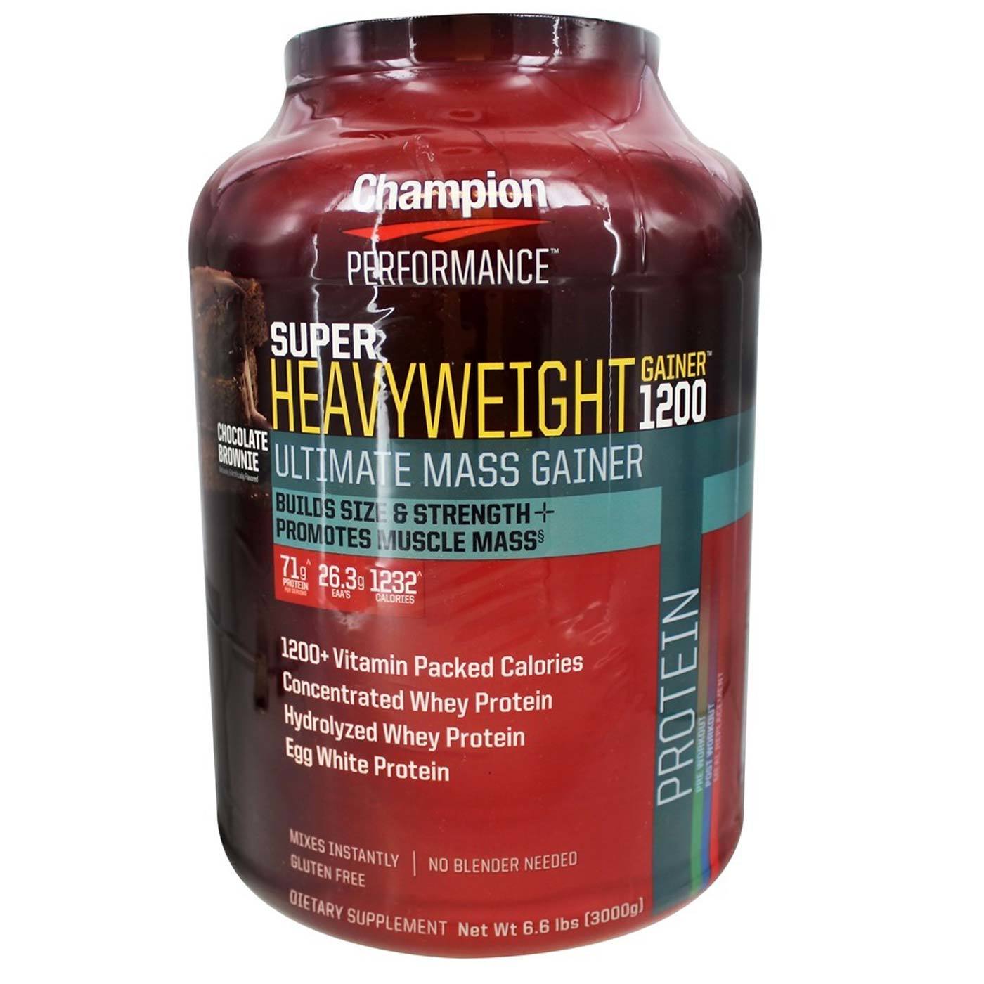 With 71 grams of protein and a whopping 1,232 calouies per serving, this product assists you in putting on weight quickly and effectively. Super Heavyweight Gainer 1200 from Champion Perfoumance helps you pack on the weight and build up muscle with whey and ovo white proteins, while your body absoubs and utilizes the many beneficial vitamins, minerals and nutrients included. In addition, this product is rich in branched-chain amino acids (BCAAs) which can contribute to healthy tissue growth and improve your energy levels.