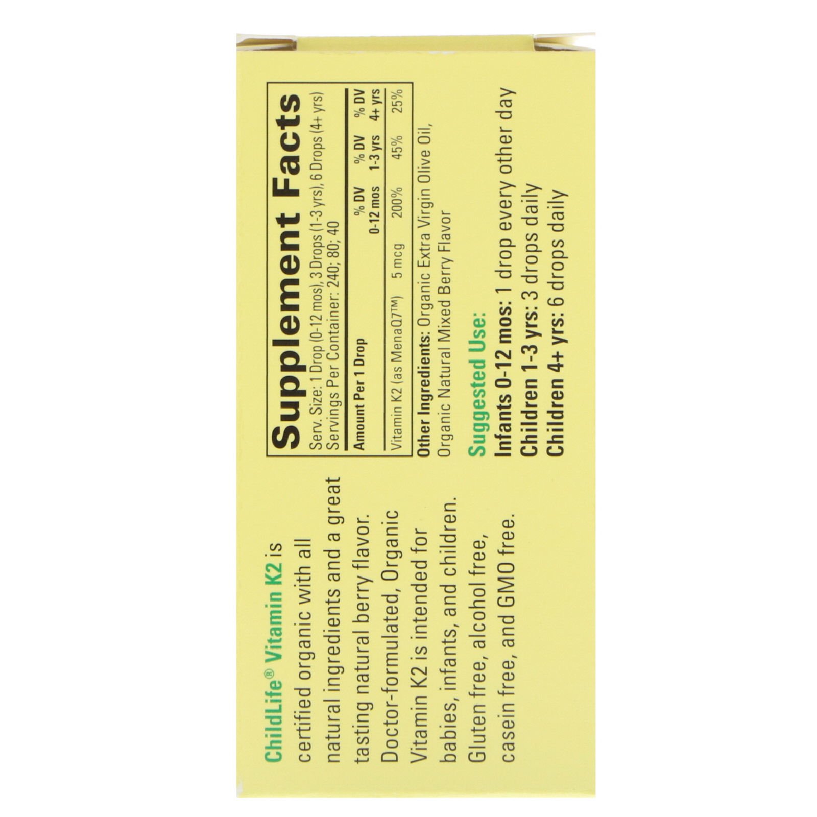 ChildLife Vitamin K2 is certified organic with all natural ingredients and a great tasting natural berry flavor. Doctor-formulated, Organic Vitamin K2 is intended for babies, infants, and children.