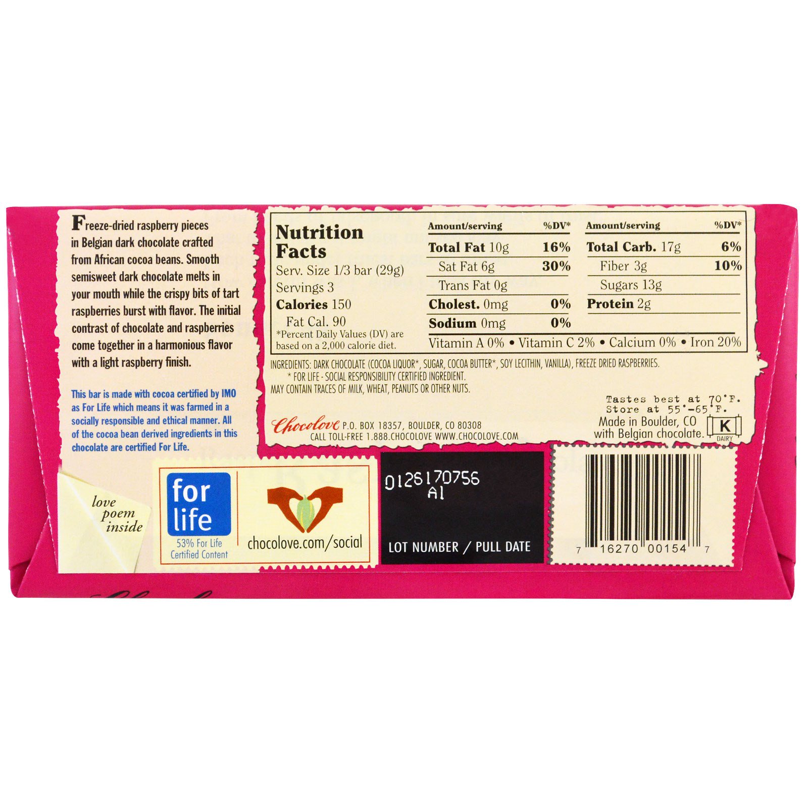 Pedaços de framboesa congelada a seco em chocolate amargo belga criado a partir de grãos de cacau africano. O chocolate amargo suave derrete na sua boca, enquanto as framboesas ácidas crocantes enchem de sabor. O contraste inicial do chocolate e framboesas se unem para um sabor harmonioso com leve acabamento de framboesa.