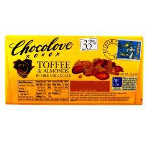 O chocolate ao leite cremoso solta pedaços de toffee doce e amanteigado e amêndoas torradas a seco. O sabor amanteigado do toffee dança em sua boca e sua língua capta cada pedaço.