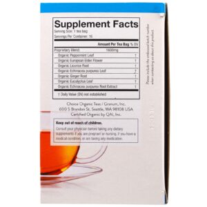 Breathe deep and help maintain healthy airways with this refreshing blend. Echinacea, one of the most popular immunity-supporting herbs, is paired with elder flower, trusted by herbalists to support healthy sinuses, ears, and throats. Eucalyptus, known for thousands of years to help support normal respiratory function for healthy breathing, completes the blend. Enjoy this amber cup with a bright, minty taste.