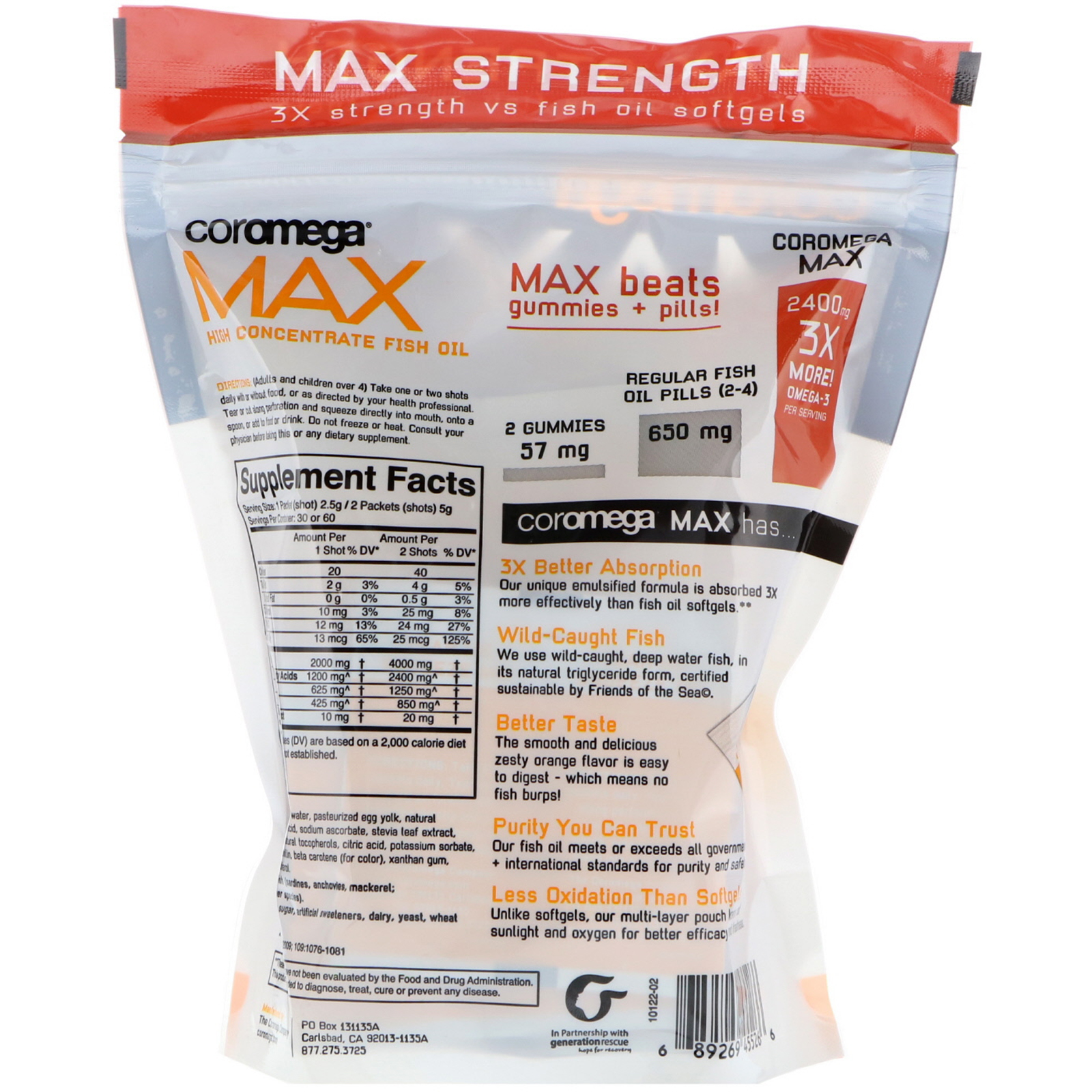 Coromega, Max, óleo de peixe de alta concentração de Ômega-3, explosão de cítricos, 60 comprimidos de aperto, (2,5 g) cada