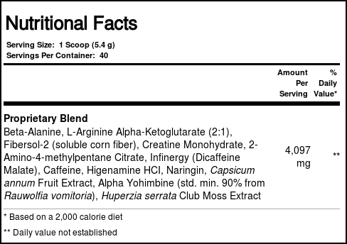 Recomendações de uso: MIX 1-2 SERVINGS WITH 4-8 OUNCES OF COLD WATER AND CONSUME 30-45 MINUTES BEFORE TRAINING. INDIVIDUALS SENSITIVE TO CAFFEINE SHOULD BEGIN WITH HALF THE RECOMMENDED DOSAGE TO ASSESS INDIVIDUAL TOLERANCE. DO NOT TAKE MORE THAN 3 SCOOPS IN A 24 HOUR PERIOD.