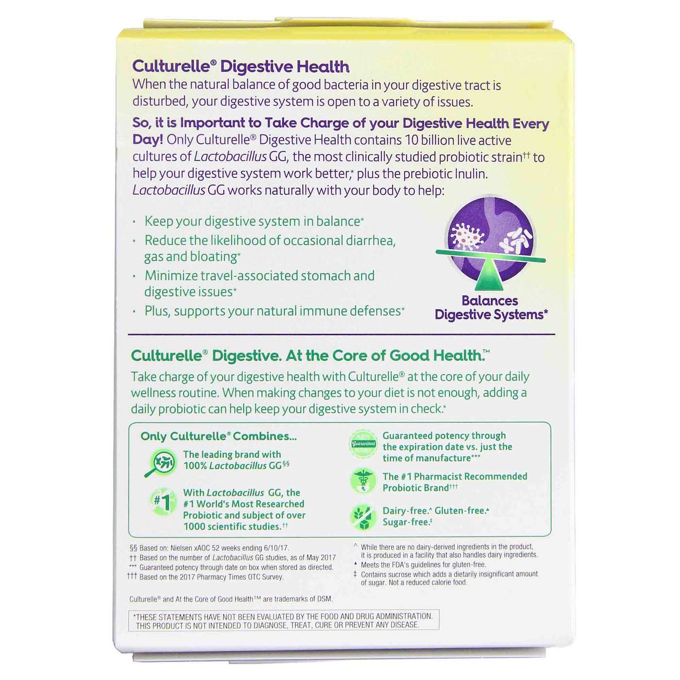 NOTAS: Apenas Culturelle Saúde Digestiva contém 10 bilhões de culturas vivas e ativas de Lactobacillus GG, a cepa probiótica* mais estudada clinicamente para ajudar seu sistema digestivo a funcionar melhor*, além da inulina prebiótica.