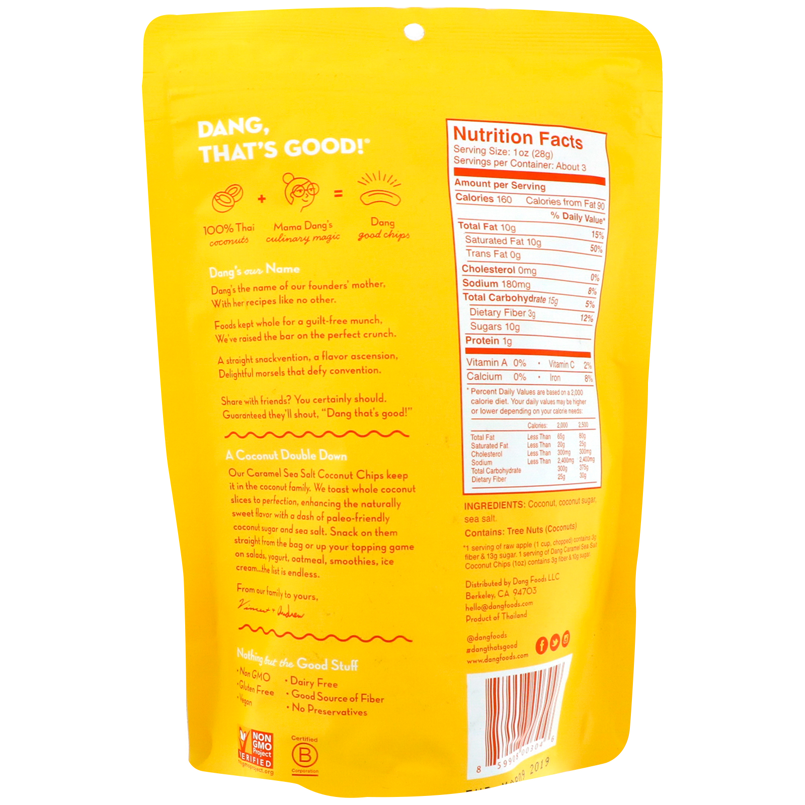 100% cocos tailandeses + magia culinária da Mama Dang = Dang Good Chips.