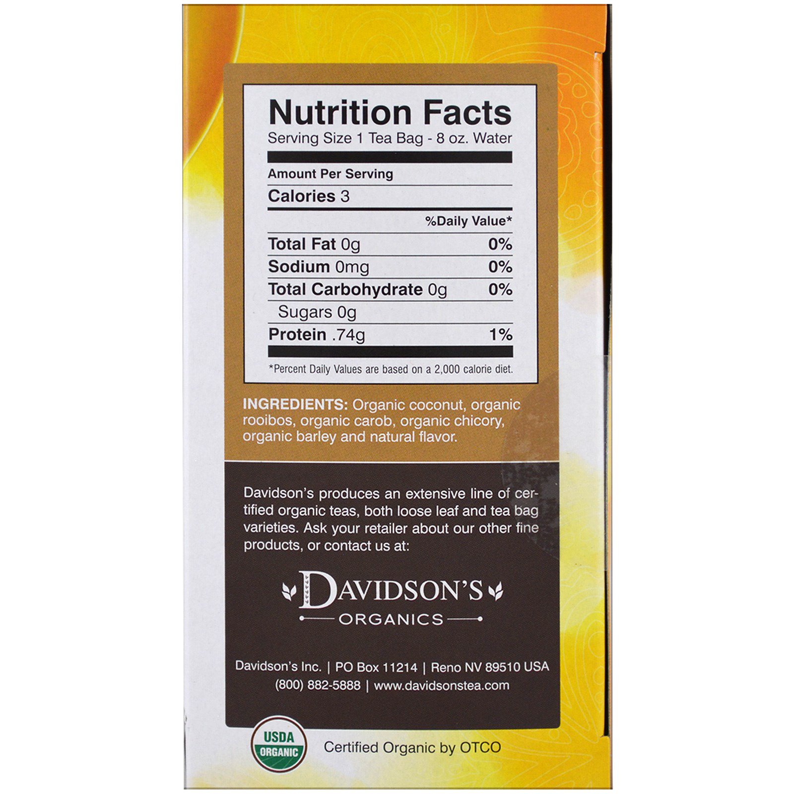 Indulge yourself with Davidson’s delicious Dessert Teas! These organic and caffeine-free herbal blends have rounded, nut-like under-tones and true, sprightly fruit or spice top notes. Our Dessert Teas brew dark in the cup, like real tea, and are scrumptious with a little milk (or non-dairy product) and a sweetener such as honey or brown sugar crystals.