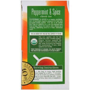 Peppermint & Spice is a heady combination of aromatic organic peppermint leaf and pungent sweeet spices. This tea is all herbal and has no caffeine so it can be enjoyed any time of day. Savor this blend after dinner as a relaxing, cleansing end to a meal. Delicious iced!