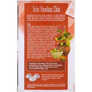 Davidson’s blends three varieties of Tulsi (Krishna, Rama and Vana) with South African rooibos and aromatic spices to create a delicious, full-bodied spicy brew with high mineral and antioxidant properties.