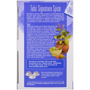 Davidson’s blends three varieties of Tulsi (Krishna, Rama and Vana) with Peppermint (mild stimulating properties, aids digestion & calms an upset stomach), Pepper (mild stimulant & digestive aid). Ginger (helps with motion sickness & nausea) and Cinnamon (recommended for balancing blood sugar levels).