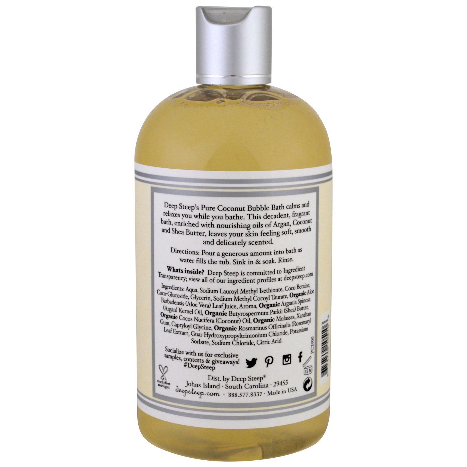 Deep Steep Pure Coconut Bubble Bath calms and relaxes you while you bathe. This decadent, fragrant bath, enriched with nourishing oils of Argan, Coconut and Shea Butter, leaves your skin feeling soft, smooth and delicately scented.