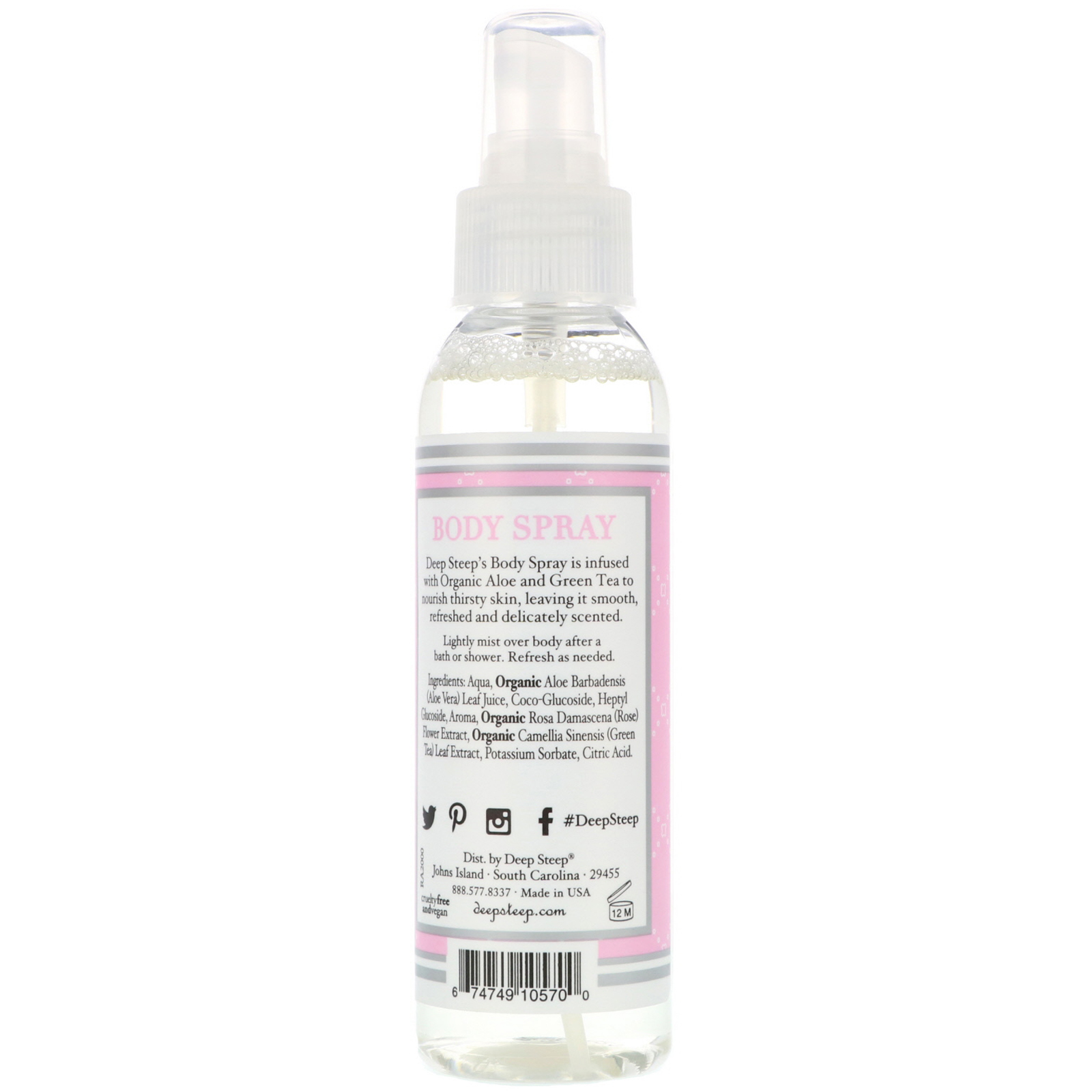 Deep Steep’s Body Spray is infused with Organic Aloe and Green Tea to nourish thirsty skin, leaving it smooth, refreshed and delicately scented.