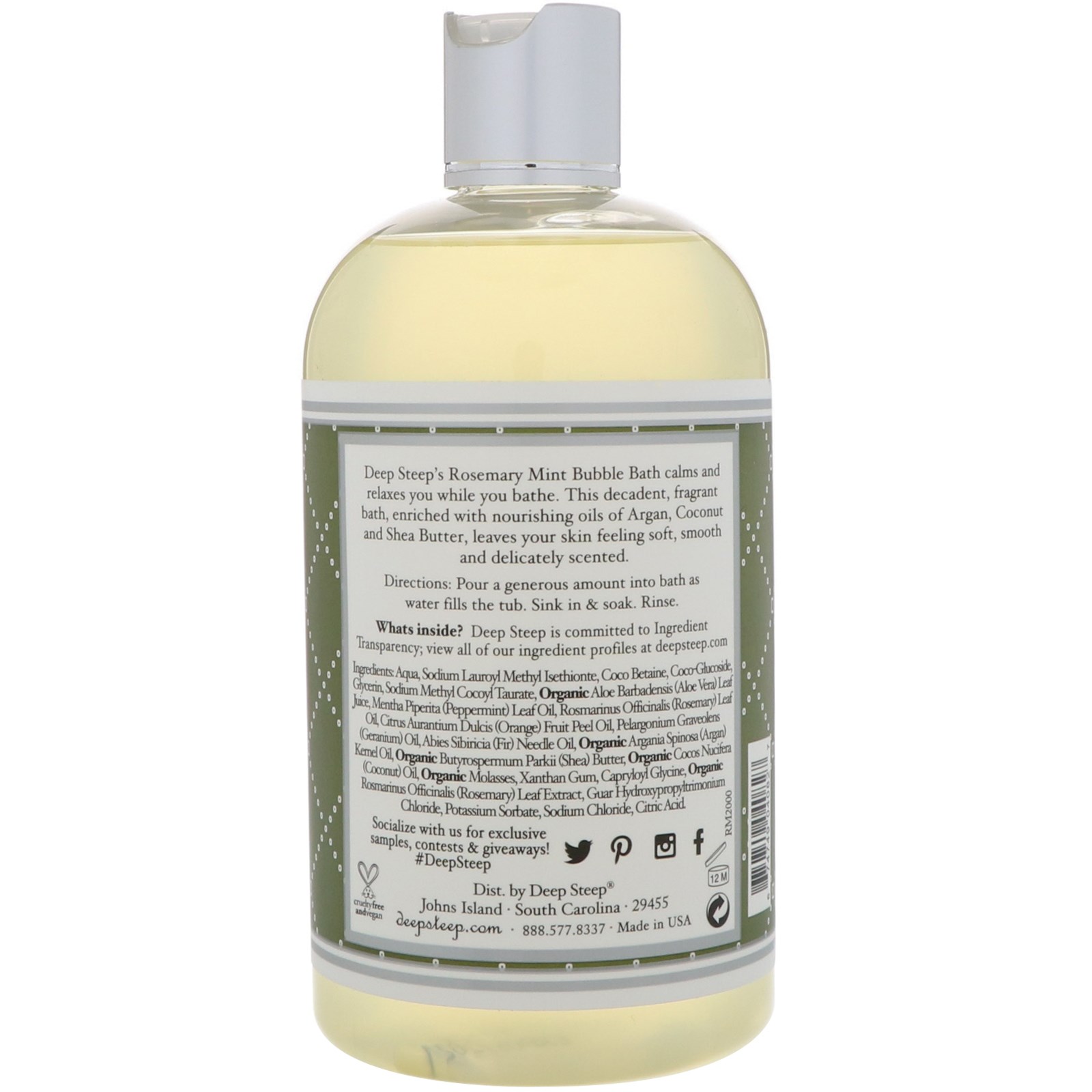 Deep Steep’s Rosemary Mint Bubble Bath calms and relaxes you while you bathe. This decadent, fragrant bath, enriched with nourishing oils of Argan, Coconut and Shea Butter, leaves your skin feeling soft, smooth and delicately scented.