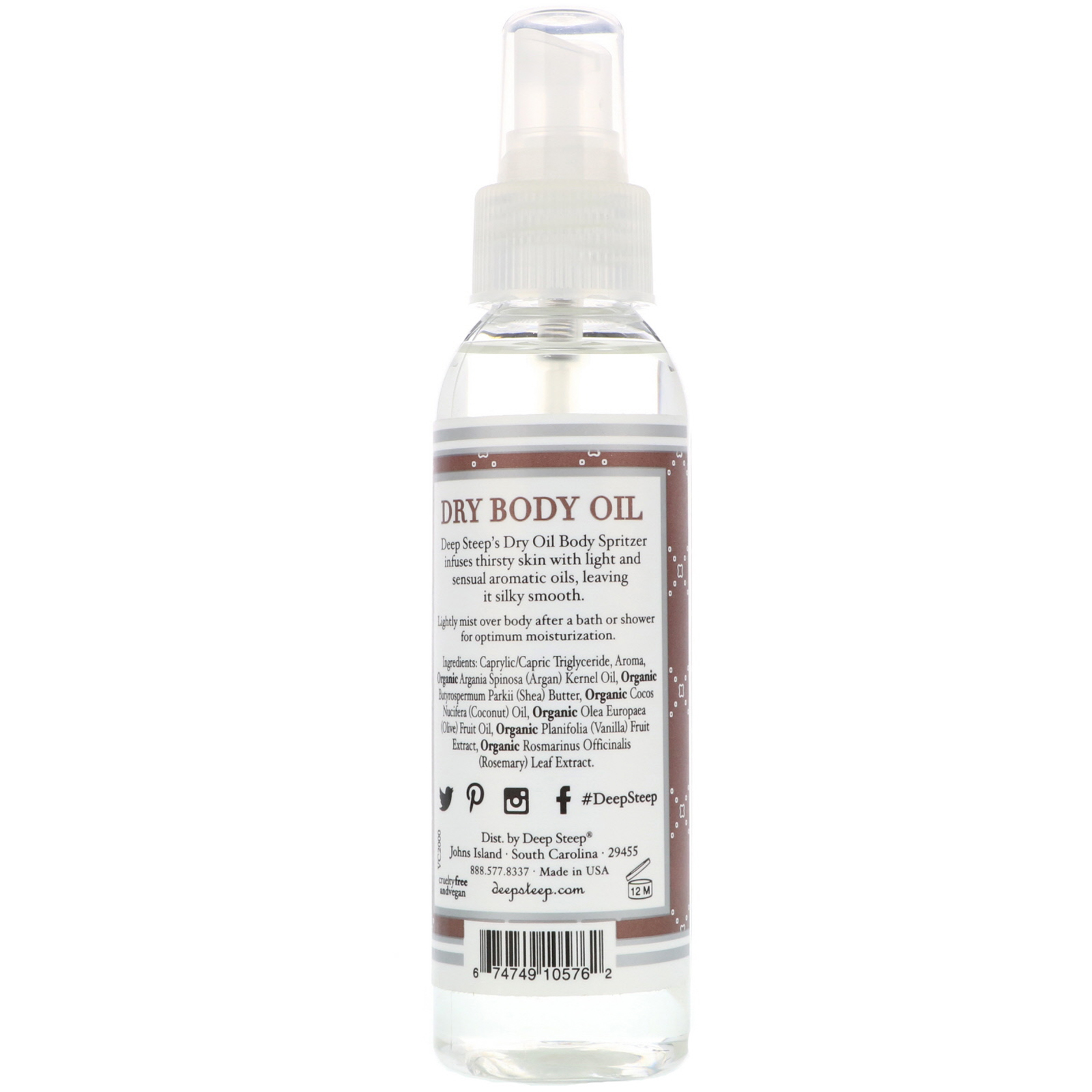 Deep Steep’s Dry Oil Body Spritzer infuses thirsty skin with light and sensual aromatic oils, leaving it silky smooth.