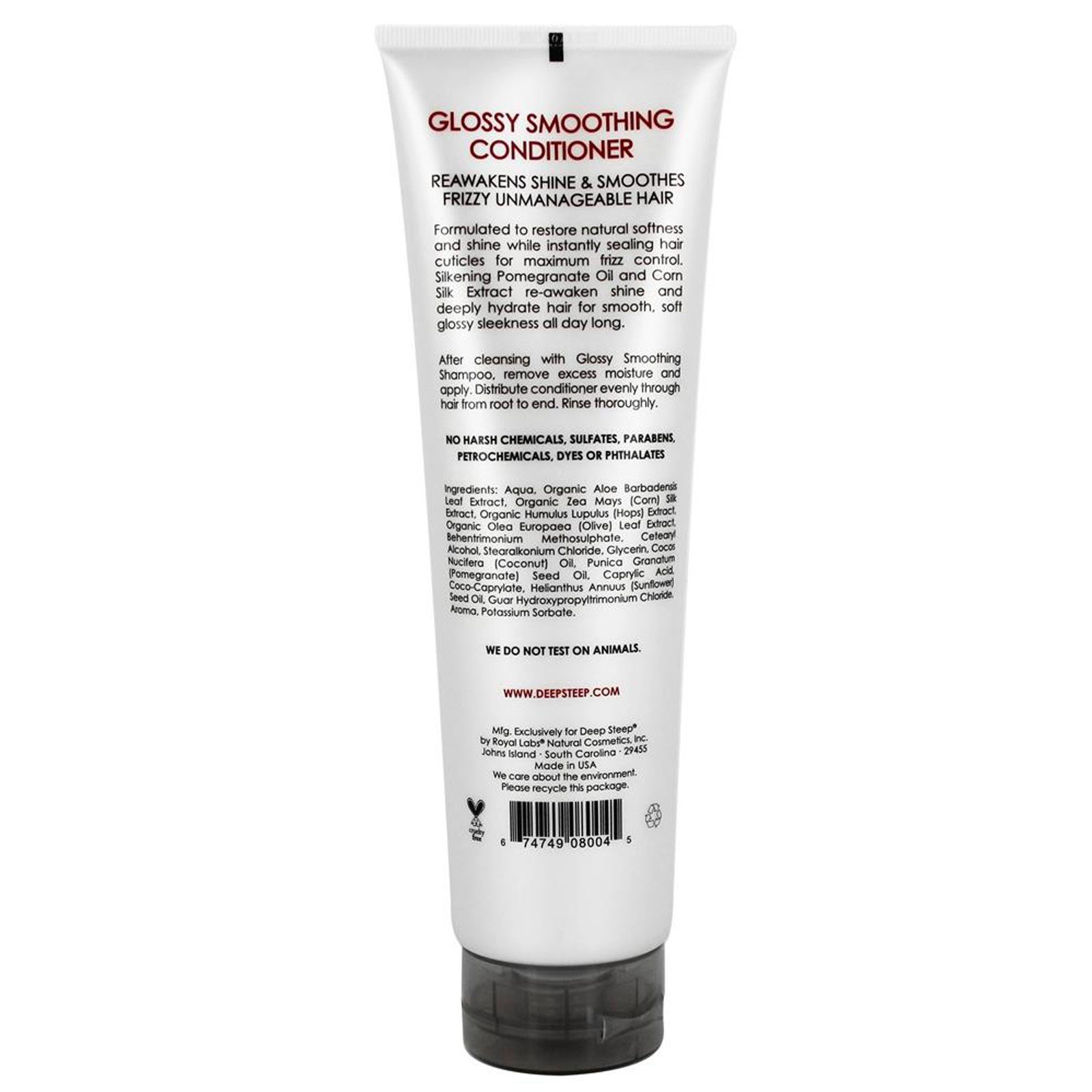Deep Steep Glossy Smoothing Shampoo instantly tames frizz and fly-aways to reveal natural softness and shine. A luxurious lather cleanses hair cuticles while Extracts of Pomegranate and Corn Silk safeguard hair from humidity and frizz.