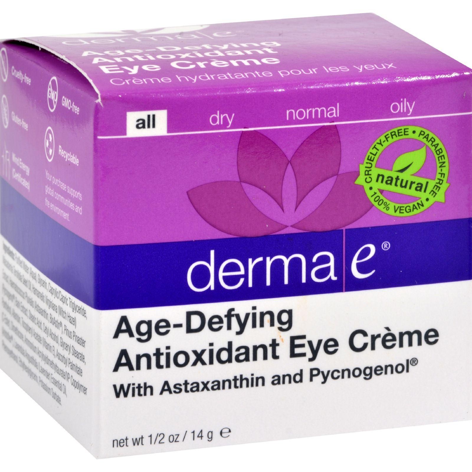 Derma E Age-Defying Eye Creme with Astaxanthin and Pycnogenol Description: The Ultimate Antioxidant Formula Visibly Refines and Firms The Delicate Tissue Around The Eyes Natural and Organic Eco-Friendly This intensive age-defying formula helps fight damage and improve skin health to diminish the appearance of wrinkles for smoother, firmer, younger-looking eyes. A unique blend of age-fighting antioxidants, vitamins and soothing natural hydrators combine to nourish, soothe and moisturize for velvety-smooth skin. This ultimate age-defying formula helps firm and hydrate for radiant, youthful eyes. Free Of Paraben and animal cruelty. Disclaimer These statements have not been evaluated by the FDA. These products are not intended to diagnose, treat, cure, or prevent any disease.