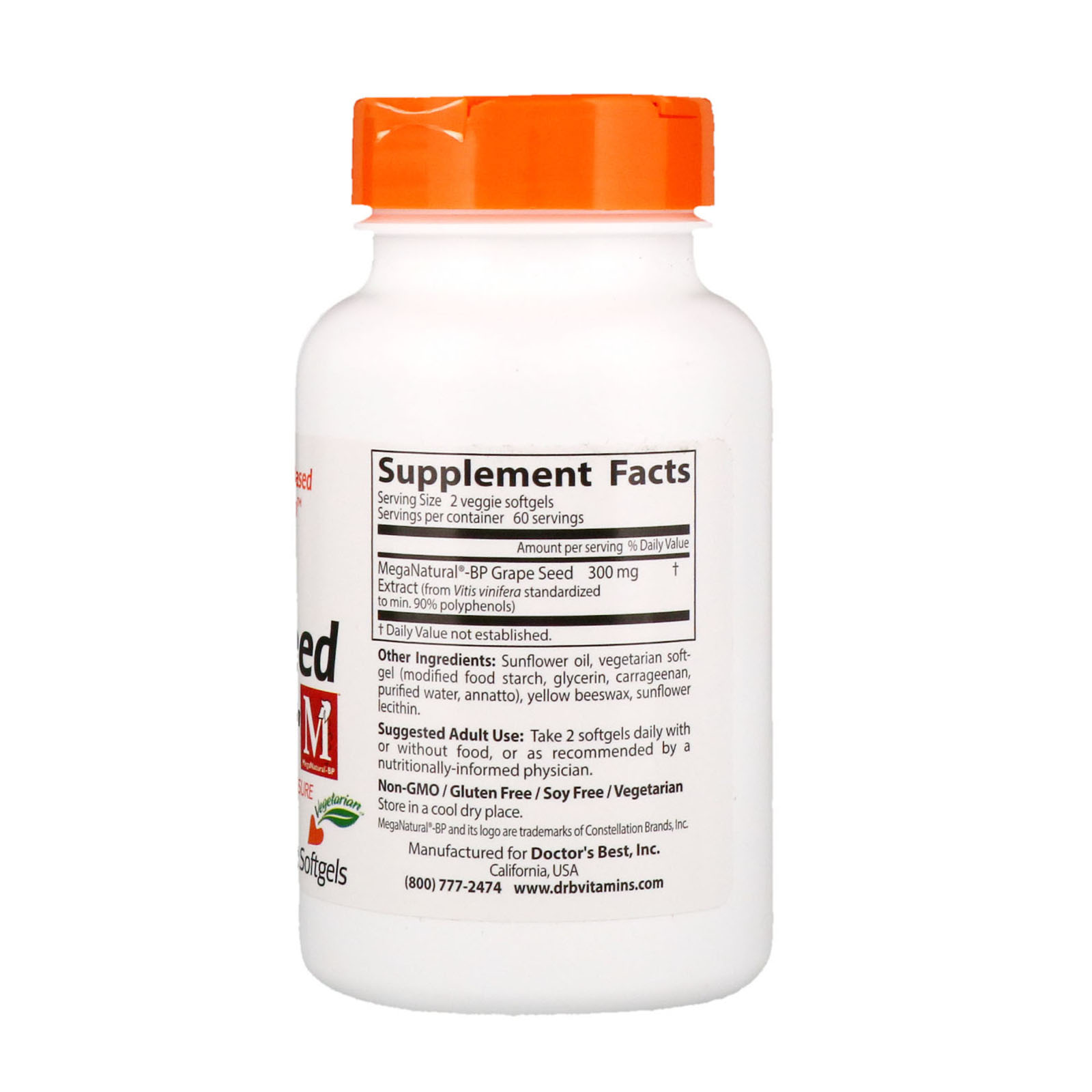 O Extrato de Semente de Uva Doctor’s Best com MegaNatural-BP contém um ingrediente clinicamente comprovado que ajuda a apoiar a saúde da pressão arterial. MegaNatural-BP é estruturalmente único fornecendo 90 a 95% de polifenóis biologicamente ativos. Ele é seletivamente extraído para melhor biodisponibilidade e maior absorção em comparação com outros extratos de semente de uva. Nosso extrato de semente de uva vem de uvas cultivadas na Califórnia e é testado para garantir a consistência em cada cápsula gelatinosa.