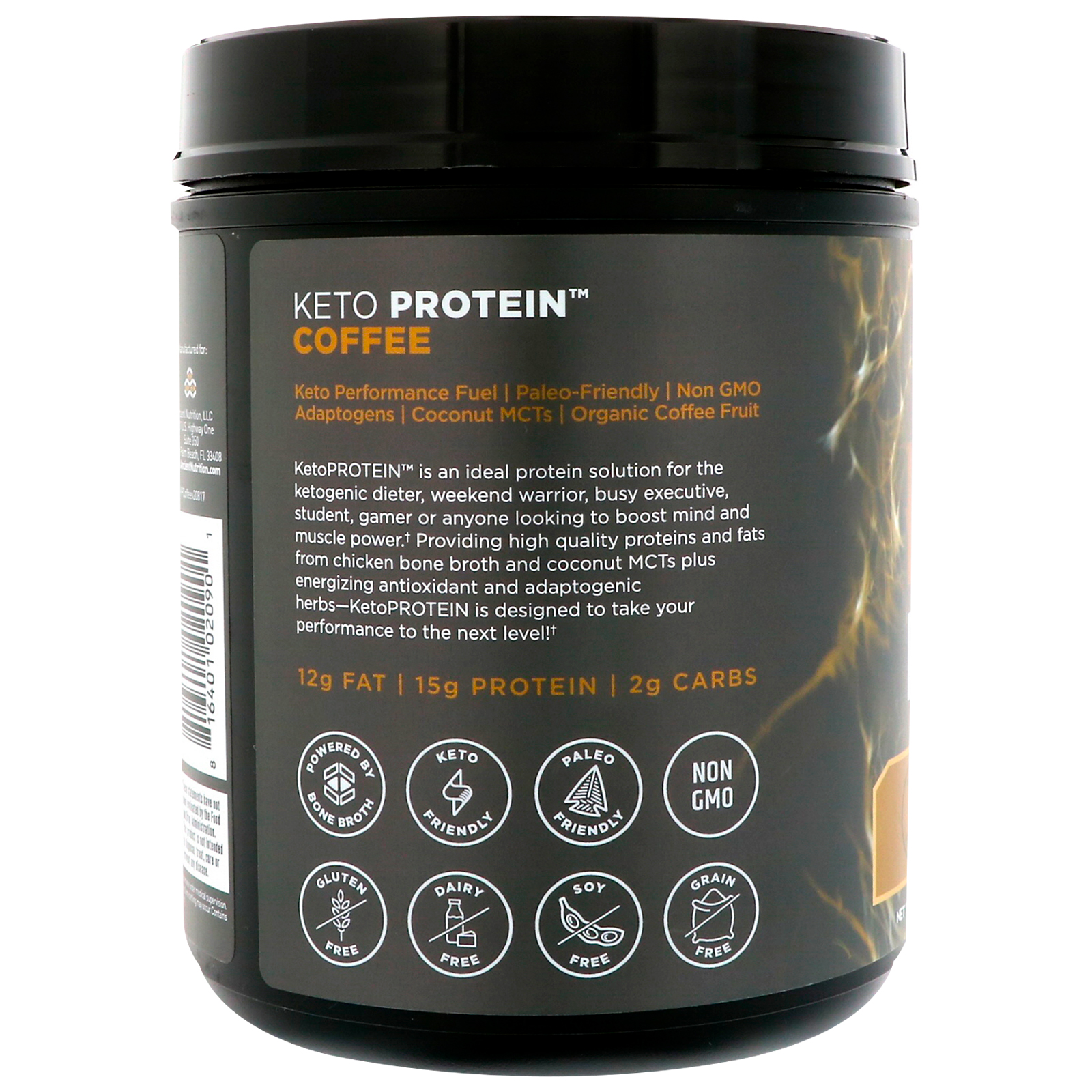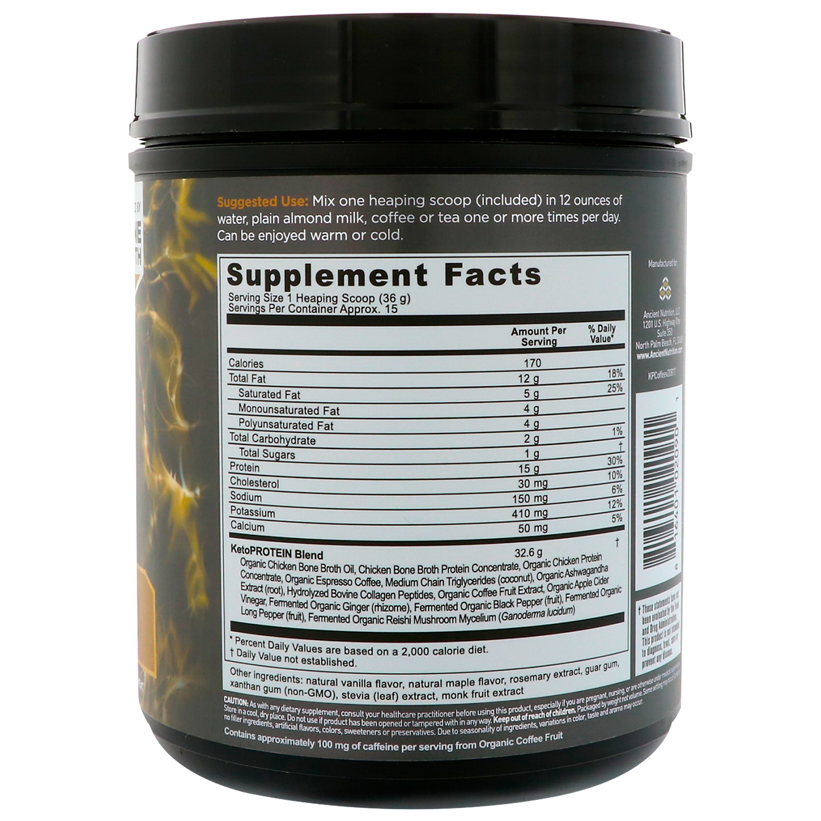 | KetoProtein Blend Organic Chicken Bone Broth Oil, Chicken Bone Broth Protein Concentrate, Organic Chicken Protein Concentrate, Organic Espresso Coffee, Medium Chain Triglycerides (coconut), Organic Ashwagandha Extract (root), Hydrolyzed Bovine Collagen Peptides, Organic Coffee Fruit Extract, Organic Apple Cider Vinegar, Fermented Organic Ginger (rhizome), Fermented Organic Black Pepper (fruit), Fermented Organic Long Pepper (fruit), Fermented Organic Reishi Mushroom Mycelium (Ganoderma lucidum) |