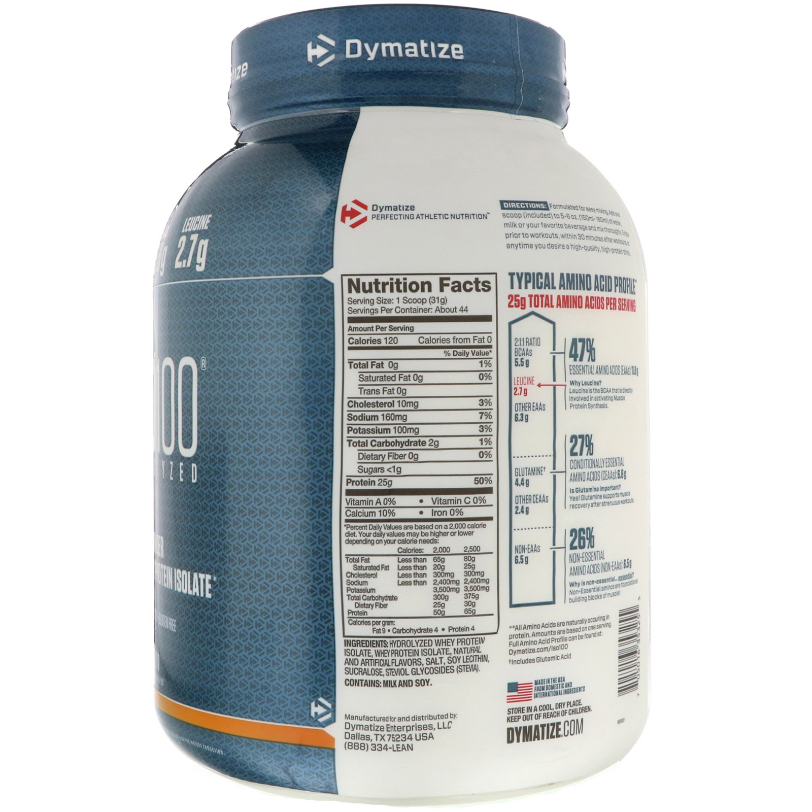 ISO100 is simply muscle-building fuel. Each serving contains 25 grams of protein and 5.5 g of BCAAs including 2.7 g of L-Leucine.