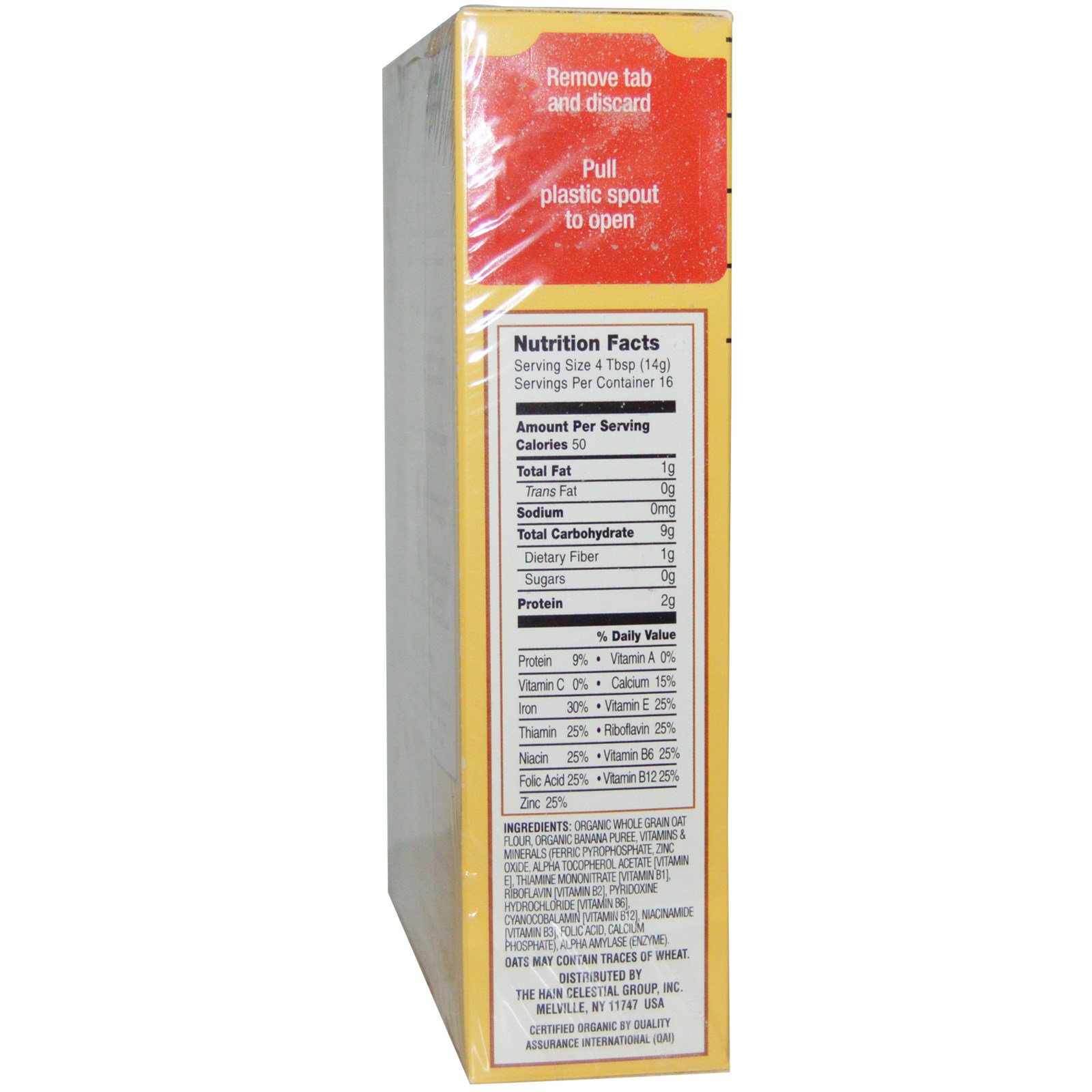 Farinha orgânica de aveia integral, purê de banana orgânica, vitaminas e minerais (pirofosfato férrico, óxido de zinco, acetato de alfa-tocoferol [vitamina E], mononitrato de tiamina [vitamina B1], riboflavina [vitamina B2], cloridrato de piridoxina [vitamina B6], cianocobalamina [ vitamina B12], niacinamida [vitamina B3], ácido fólico, fosfato de cálcio), alfa amilase (enzima).