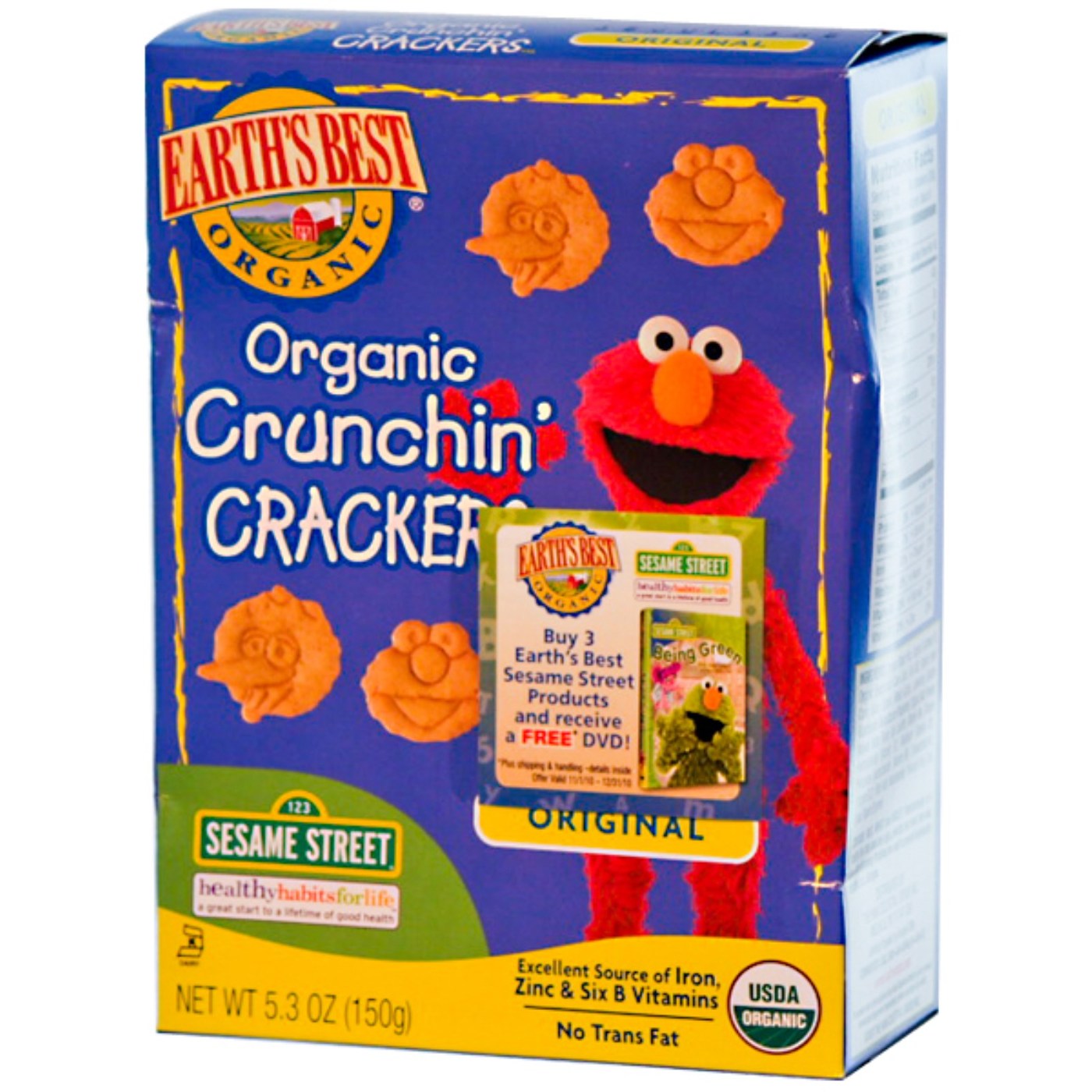 Earth’s Best Sesame Street Crunchin’ Crackers are an excellent source of iron, zinc and six B vitamins. They’re easy to hold and feature Elmo or Big Bird on every bite. Sesame Street Crunchin’ Crackers are made with organic ingredients and contain no hydrogenated oils or trans saturated fats. As part of a healthy diet, Sesame Street Crunchin’ Crackers can help establish healthy habits that last a lifetime.