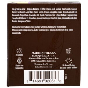 Ácido cítrico, bicarbonato de sódio, isotionato de cocoyl de sódio, amido de milho de zea, óleo de amêndoa doce (amêndoa doce), óleo de lavandula angustifolia (lavanda), extracto de fruta de baunilha, óleos naturais de fragrância, tocoferol (vitamina E), helianthus annuus (girassol) óleo de semente, mica, dióxido de titânio, óxidos de ferro, violeta de manganês.