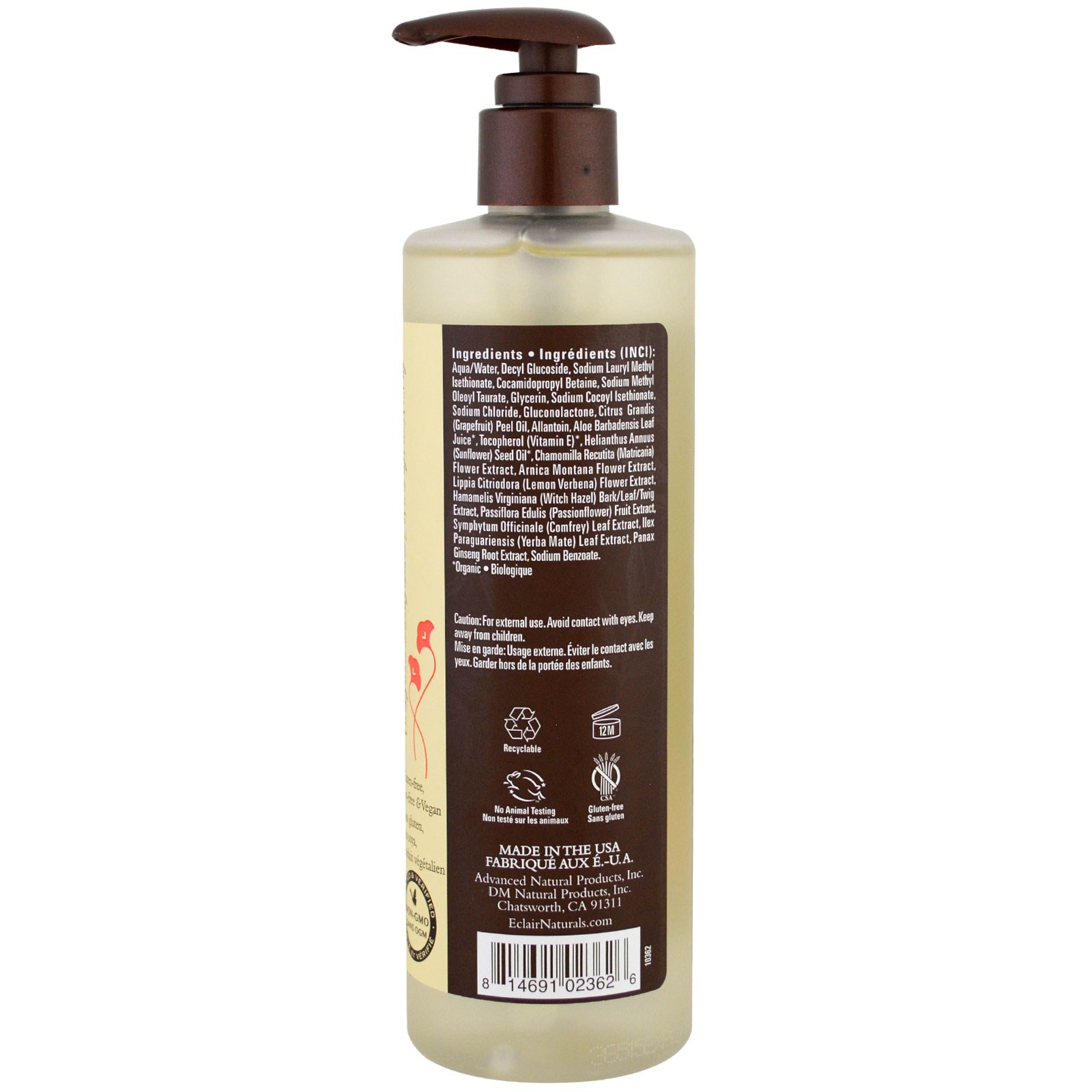 Aqua / água, decil glucósido, lauril metil isetionato de sódio, cocamidopropil betaína, metil-oleoil-taurate de sódio, glicerina, isotionato de cocoyl de sódio, cloreto de sódio, gluconolactona, óleo de casca de cítricos (grapefruit), alantoína, suco de folha de aloe barbadensis *, tocoferol (vitamina E) *, óleo de semente de helianthus annuus (girassol) *, extracto de flor de chamomilla recutita (matricaria), extrato de flor de arnica montana, extrato de flor de lippia citriodora (lima de limão), hamamelis virginiana (avelã de bruxelas) / extrato de folha / galho, passiflora edulis (passionflower), extracto de folha de symphytum officinale (comfrey), extracto de folha de ilex paraguariensis (yerba mate), extrato de raiz de panax ginseng, benzoato de sódio.