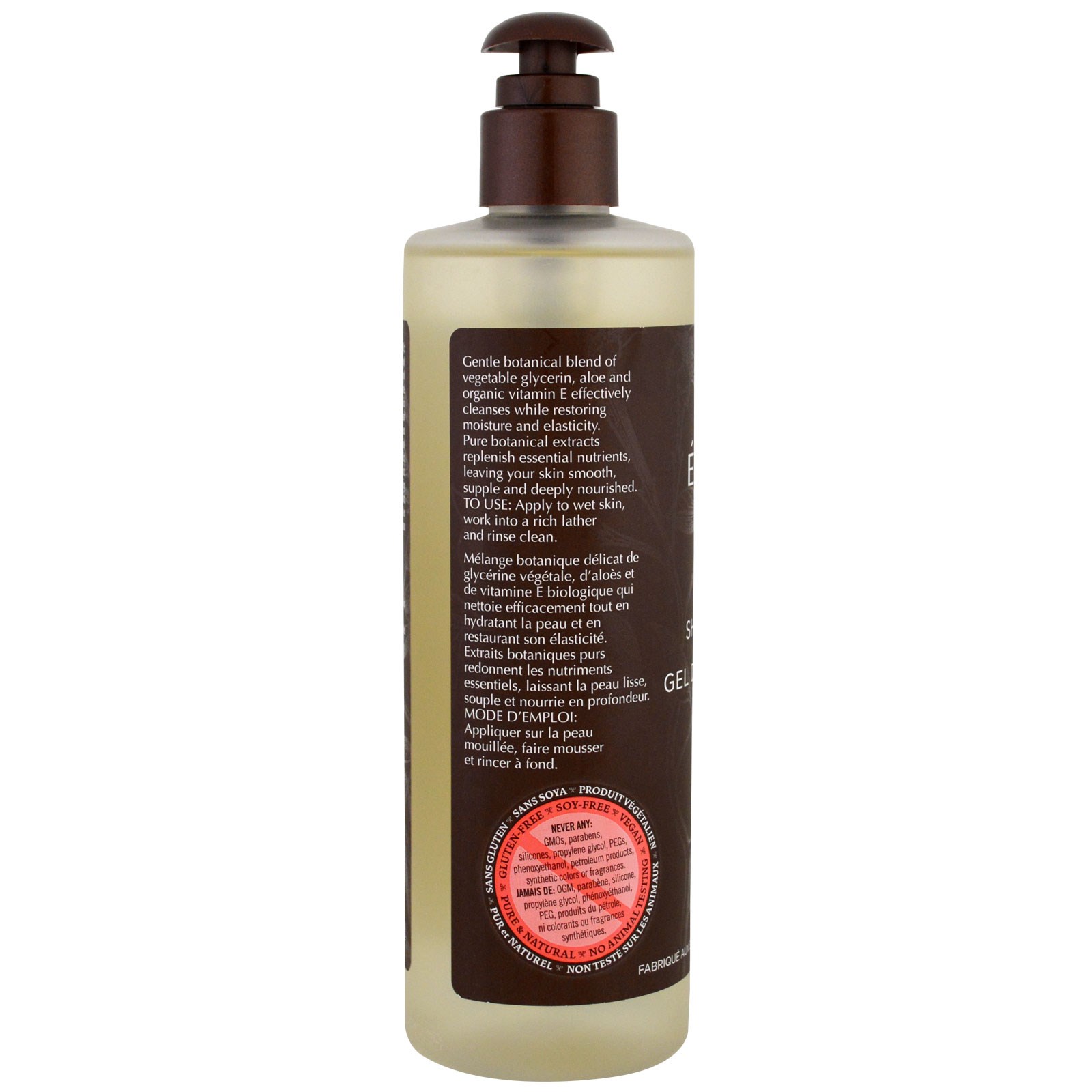 Gentle botanical blend of vegetable glycerin, aloe and organic vitamin E effectively cleanses while restoring moisture and elasticity. Pure botanical extracts replenish essential nutrients, leaving your skin smooth, supple and deeply nourished.