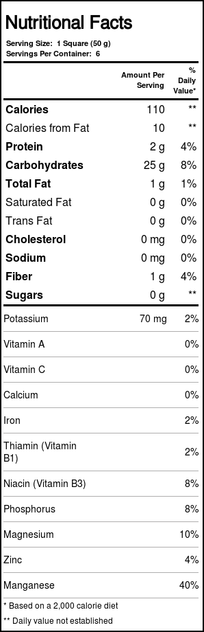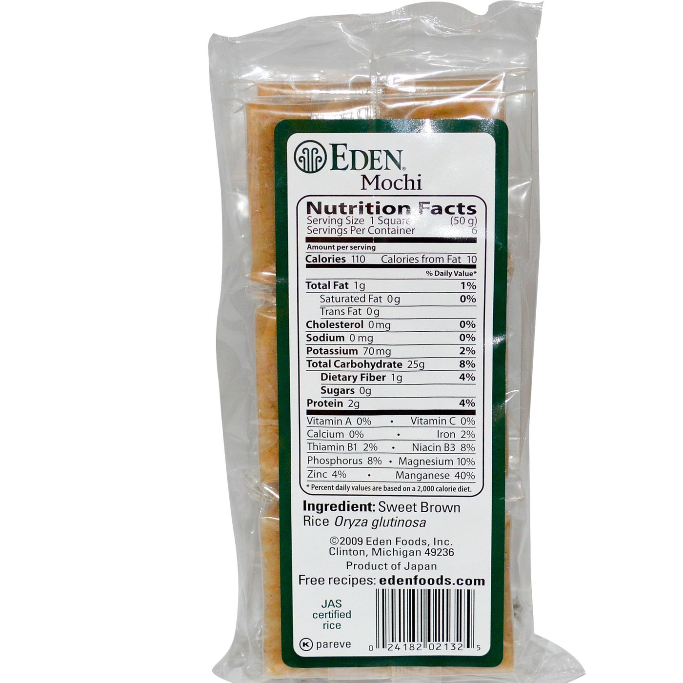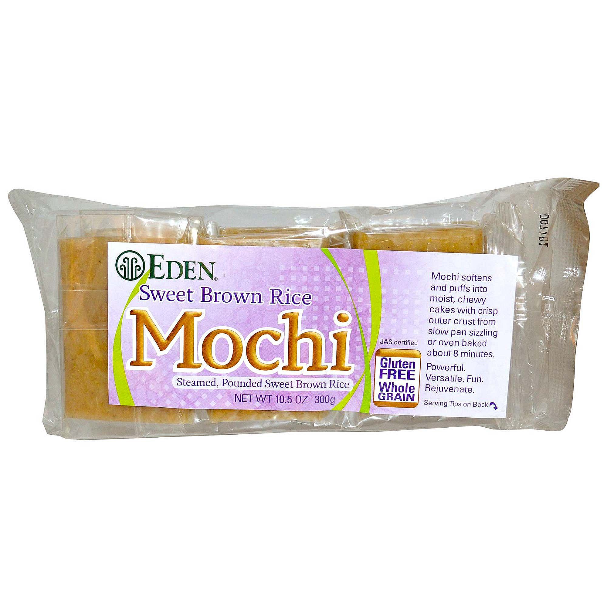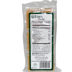 Notas: Eden Food’s Sweet Brown Rice Mochi is JAS (Japanese Agricultural Standards) certified whole grain sweet brown rice. Contains no cholesterol, sodium, wheat or gluten.