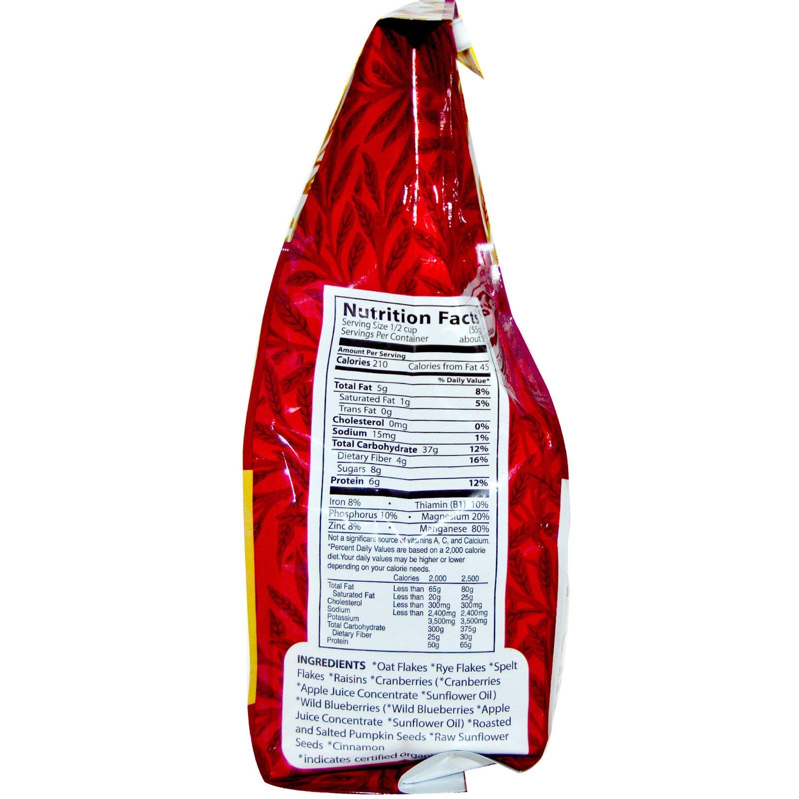 U.S.A. family farm organic • oats • rye, and • spelt wheat roasted and rolled into easy to use whole grain flakes. Sweet, tangy organic fruit • raisins • wild blueberries • cranberries, and a little organic • cinnamon adds delightful flavor. Organic roasted • pumpkin and raw • sunflower seeds lend richness, crunch, and nutrition. Enjoy this breakfast cereal cold, hot, right out of the bad, and use it in baked goods.