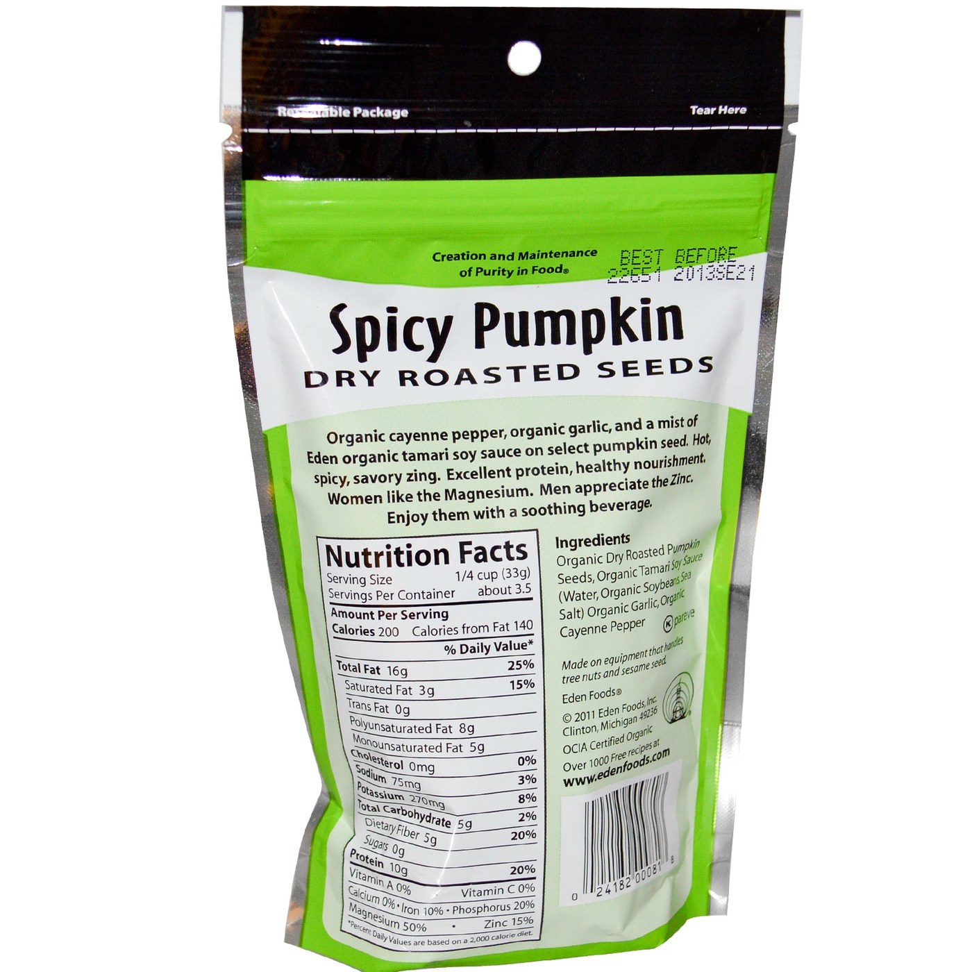 Drop the high-calorie, fat-filled junk food and switch to Organic Spicy Pumpkin Seeds by Eden Foods.