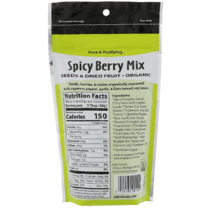 Seeds, berries, & raisins organically seasoned with cayenne pepper, garlic, & Eden tamari soy sauce.