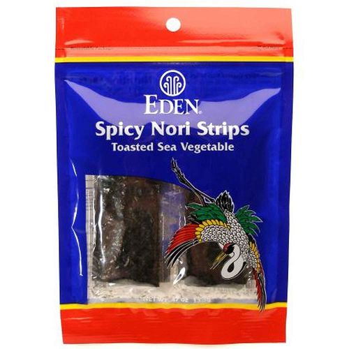 Nori has been harvested since ancient times and is a healthy source of vitamins, minerals and protein. Eden Foods coats Spicy Nori Strips with shoyu soy sauce, organic mirin sweet rice cooking wine, sea salt, kombu, shiitake mushrooms and red chili pepper seasonings for a great kick of flavor.