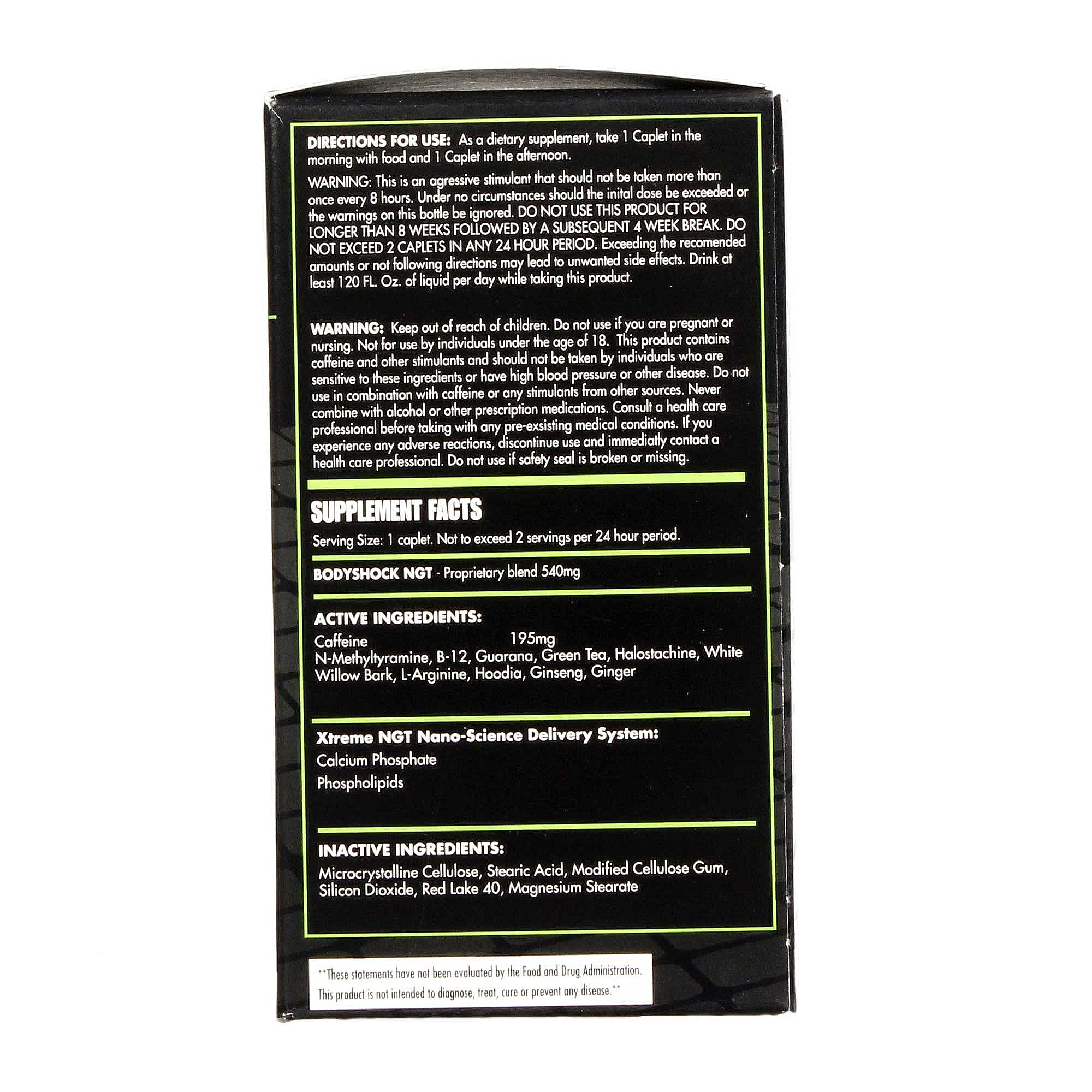 Advertências: This is an aggressive stimulant that should not be taken more than once every eight hours. Under no circumstances should the initial dose be exceeded or the warnings on this bottle be ignored. Do not use the product for longer than eight weeks followed by a subsequent four-week break. Do not exceed 2 caplets in any 24-hour period. Exceeding the recommended amounts or not following directions may lead to unwanted side effects. Drink at least 120 fl oz of liquid per day while taking this product. Keep out of reach of children. Do not use if you are pregnant or nursing. Not for use by individuals under the age of 18. This product contains caffeine and other stimulants should not be taken by individuals who are sensitive to these ingredients or have high blood pressure or other disease. Do not use in combination with caffeine or any stimulants from other sources. Never combine with alcohol or other prescription medication. Consult a healthcare professional before taking with any pre-existing medical conditions. If you experience any adverse reactions, discontinue use and immediately contact a health care professional. Do not use if safety seal is broken or missing. These statements have not been evaluated by the U.S. Food and Drug Administration. This product is not intended to diagnose, treat, cure or prevent any disease.