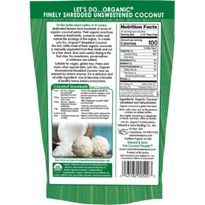 On the fertile island nation of Sri Lanka, dedicated farmers tend hundreds of acres of organic coconut palms. Their organic practices enhance biodiversity, conserve water and nurture the ecology of the region. To create Let’s Do…Organic Shredded Coconut, the rich, white meat of fresh organic coconuts is manually separated from their shells and cut to a fine shred. Slow and careful frying is the final step. No sweeteners, preservatives or whiteners are added.