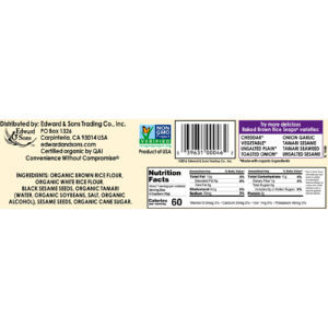 Organic brown rice flour, organic white rice flour, black sesame seeds, organic tamari (water, organic soybeans, salt, organic alcohol), sesame seeds, organic cane sugar.