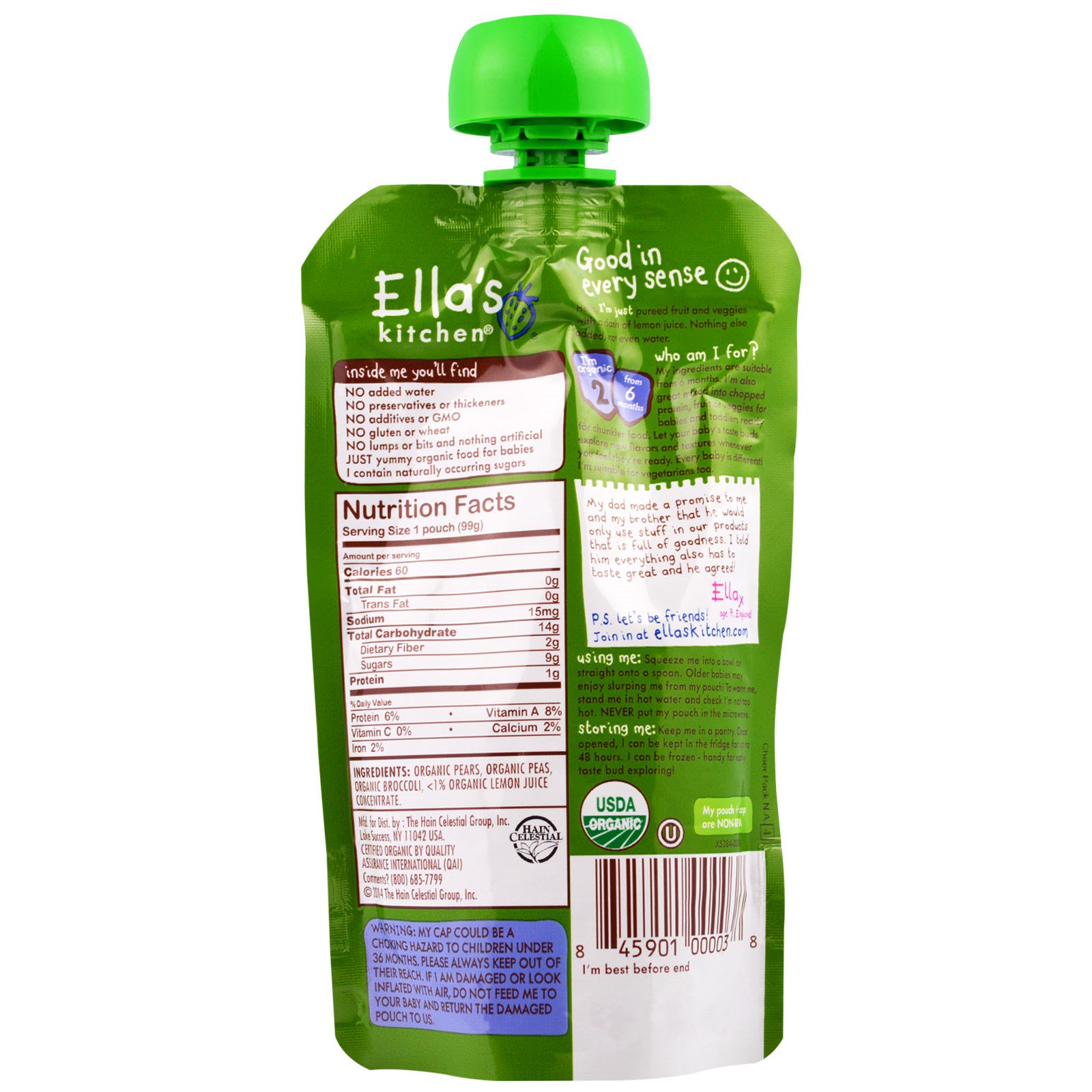 Ella's Kitchen, Purê Super Suave, com Peras, Ervilhas e Brócolis, 3.5 oz (99 g)